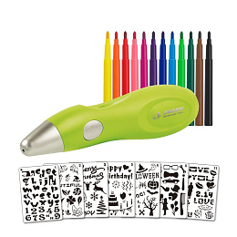 Elektronické sprejové pero vám umožní dosáhnout efektů, které byly dosud vyhrazeny profesionálním umělcům – od jemných mlh po výrazné detaily. Stačí vybrat jeden z 12 barevných fixů, vložit ho do zařízení a stisknout tlačítko, aby se barevný sprej objevil na papíře. Sedmička obsahuje šablony s písmeny, čísly a zábavnými vzory vás inspirují k tvorbě originálních kompozic a experimentování s různými technikami.