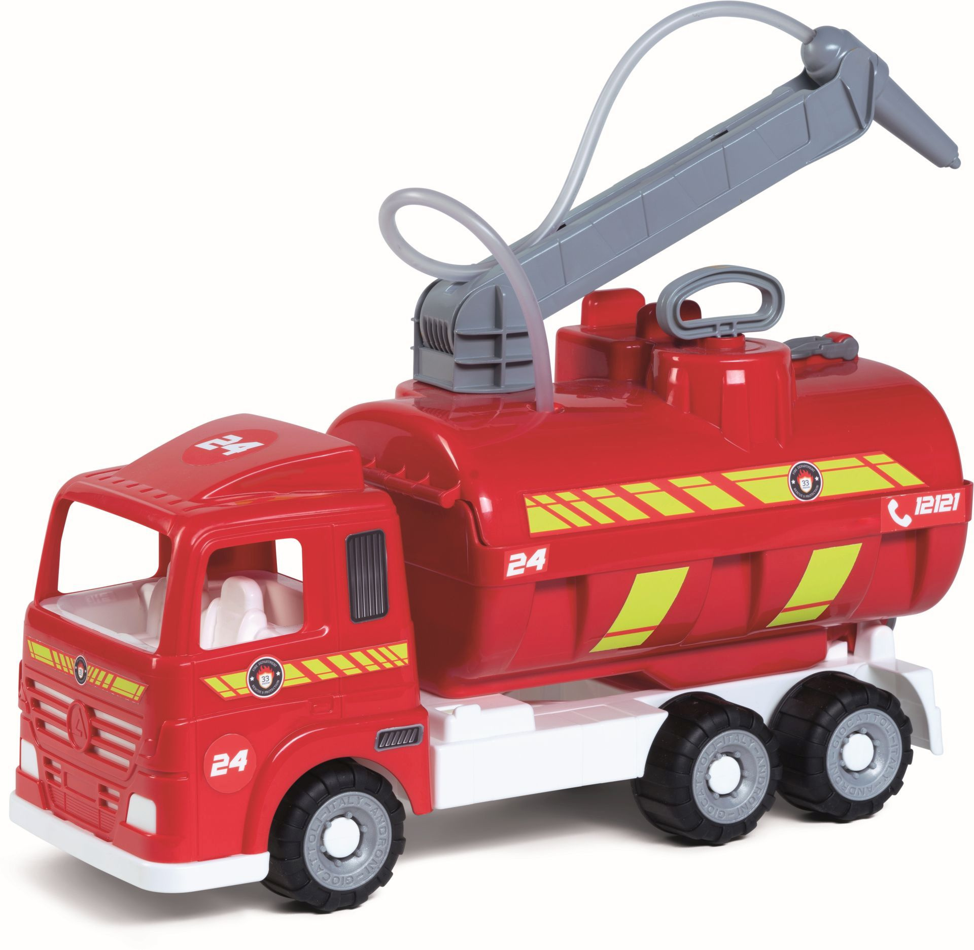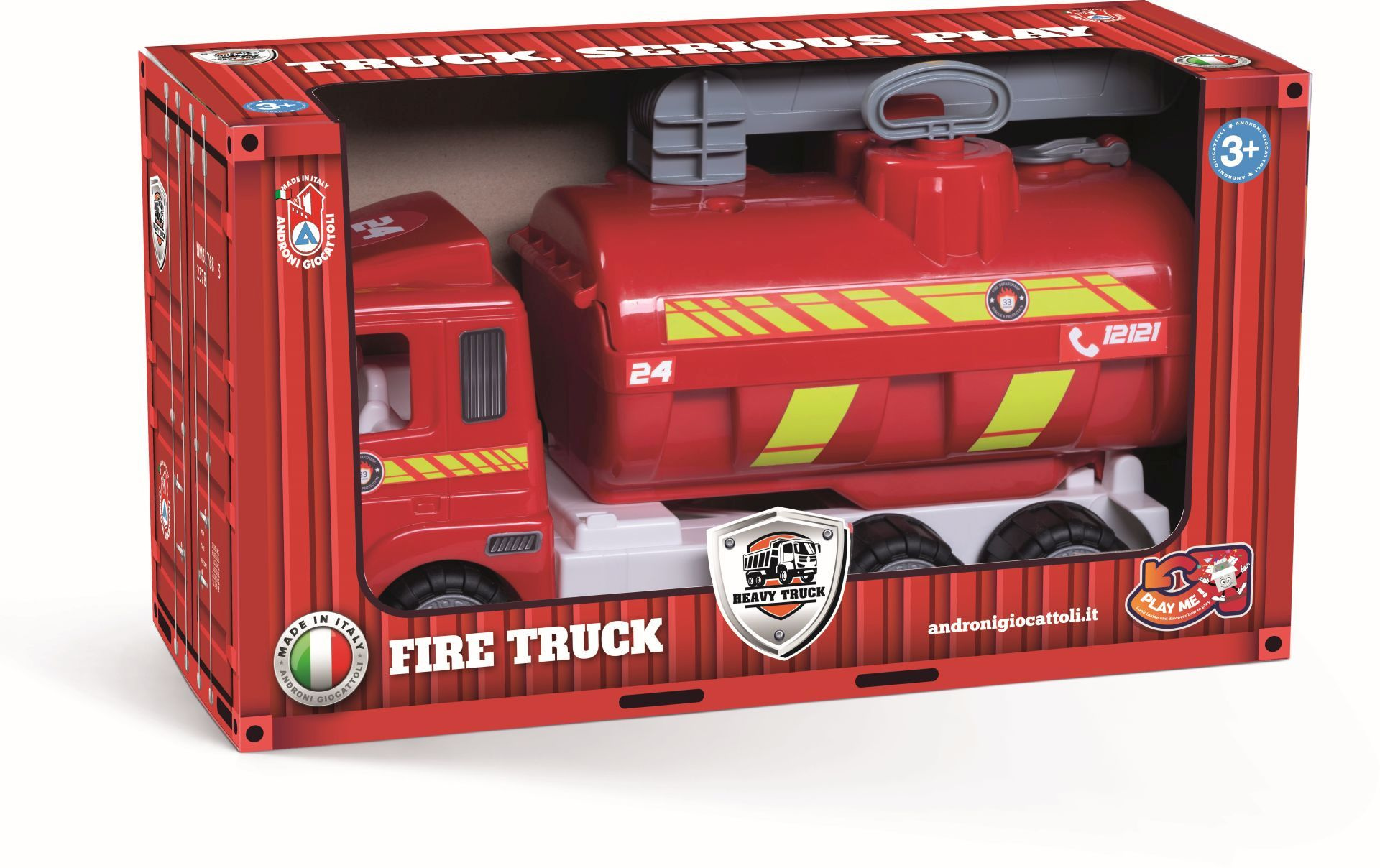 Velké funkční plastové hasičské auto s ruční pumpou a funkční stříkačkou s pogumovanými koly z řady Heavy Trucks v otevřené krabici. Vyrobené z kvalitních plastů v Itálii. Rozměry balení: 49 x 18 x 27 cm (d x š x v). Váha: 1,59 kg. Doporučený věk od 36 měsíců.