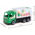 Velké funkční plastové auto popeláři s kontejnerem z řady Heavy Trucks s pogumovanými koly v otevřené krabici. Délka vozu s nasazenou popelnicí je 55 cm. Vyrobené z kvalitních plastů v Itálii. Rozměry balení: 51,5 x 18,7 x 24,5 cm (d x š x v). Váha: 1,58 kg. Doporučený věk od 12 měsíců.