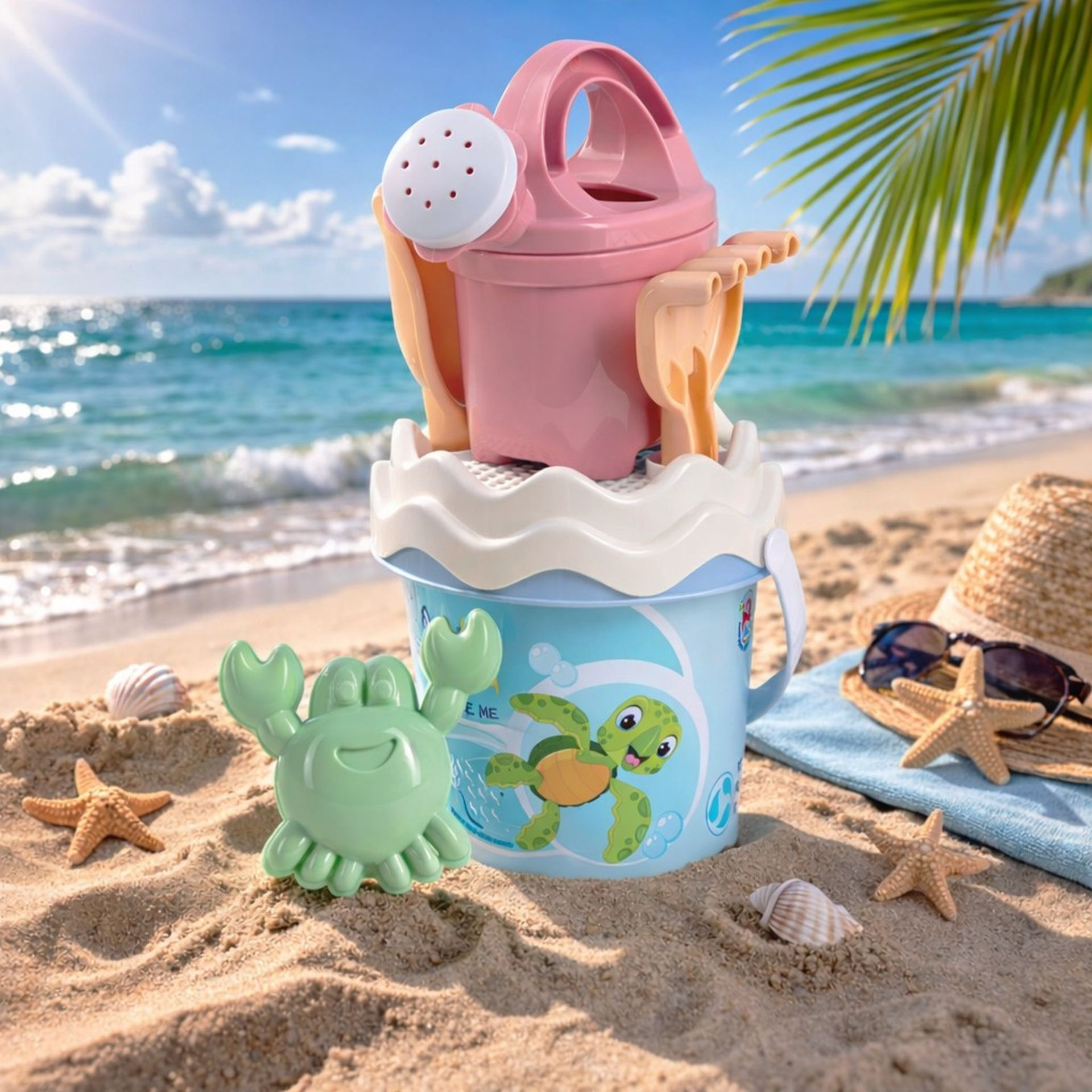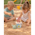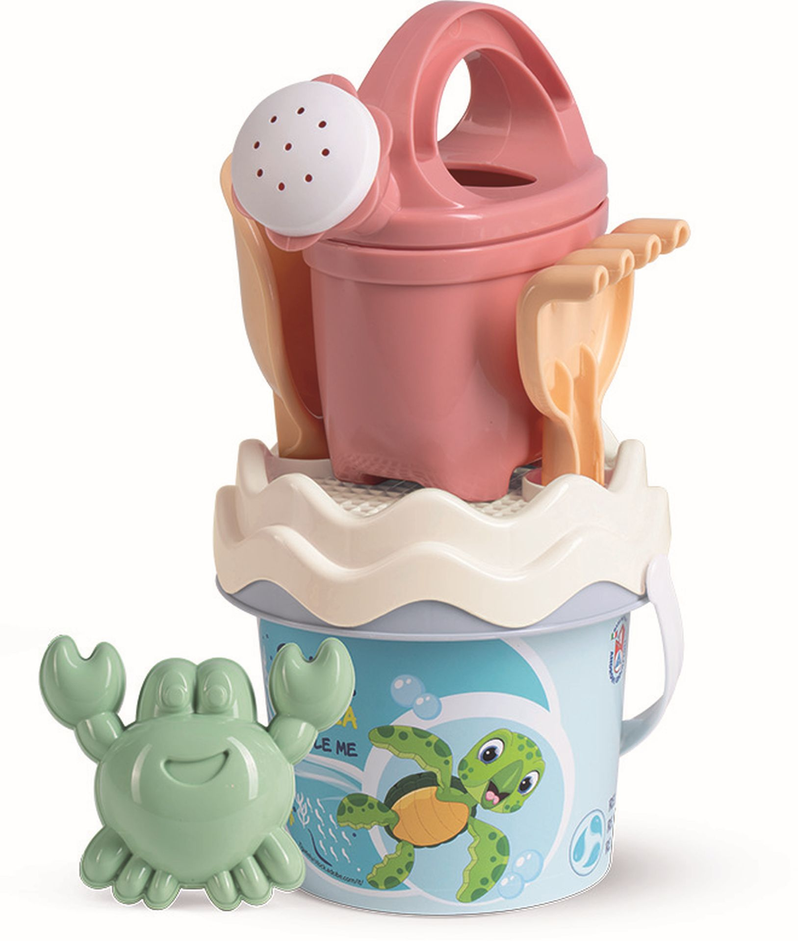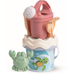 6dílná sada na písek, vyrobená z kvalitních recyklovaných plastů v pastelových barvách v Itálii. Obsahuje: Kyblík, konvičku 0,5 l, sítko, lopatku, hrabičky a tvořítko ve tvaru mořského kraba. Kyblík: průměr 13 cm, výška 11 cm. Sada: výška 27,5 cm, váha 0,244 kg. Doporučený věk od 10 měsíců.