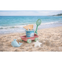 6dílná sada na písek, vyrobená z kvalitních plastů v pastelových barvách v Itálii. Obsahuje: vozík s rukojetí, jejíž konec lze využít jako sítko, kyblík, lopatku, hrabičky a tvořítka ve tvaru rybky a hvězdice. Rozměry vozíku: 27 x 22 x 10 cm (d x š x v), délka rukojeti 30 cm, kyblík o průměru 17 cm a výšce 16 cm. Sada: 30 x 22 x 27 cm (d x š x v). Váha: 0,528 kg. Doporučený věk od 10 měsíců.
