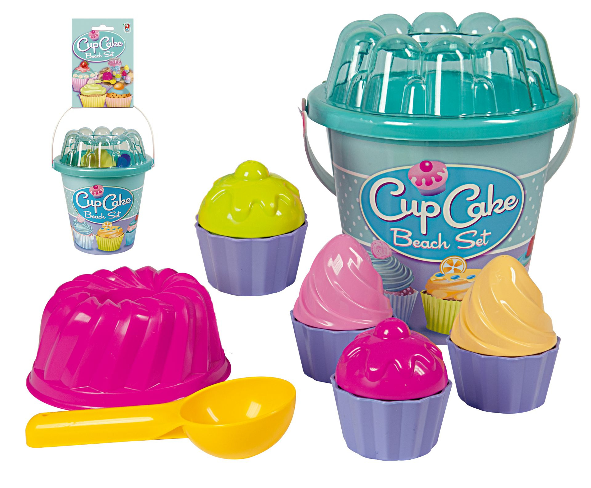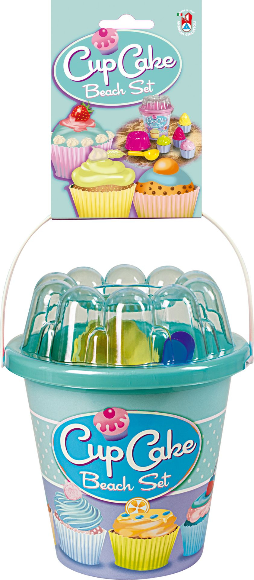 12dílná sada na písek, vyrobená z kvalitních plastů v Itálii. Obsahuje: Kyblík s víkem ve tvaru velké bábovky, tvořítko ve tvaru menší bábovky, kopečkovač na zmrzlinu, 4 čepičky zmrzlin a 4 misky. Kyblík: průměr 17 cm, výška 16 cm. Sada: výška 21 cm, váha 0,45 kg. Doporučený věk od 12 měsíců.