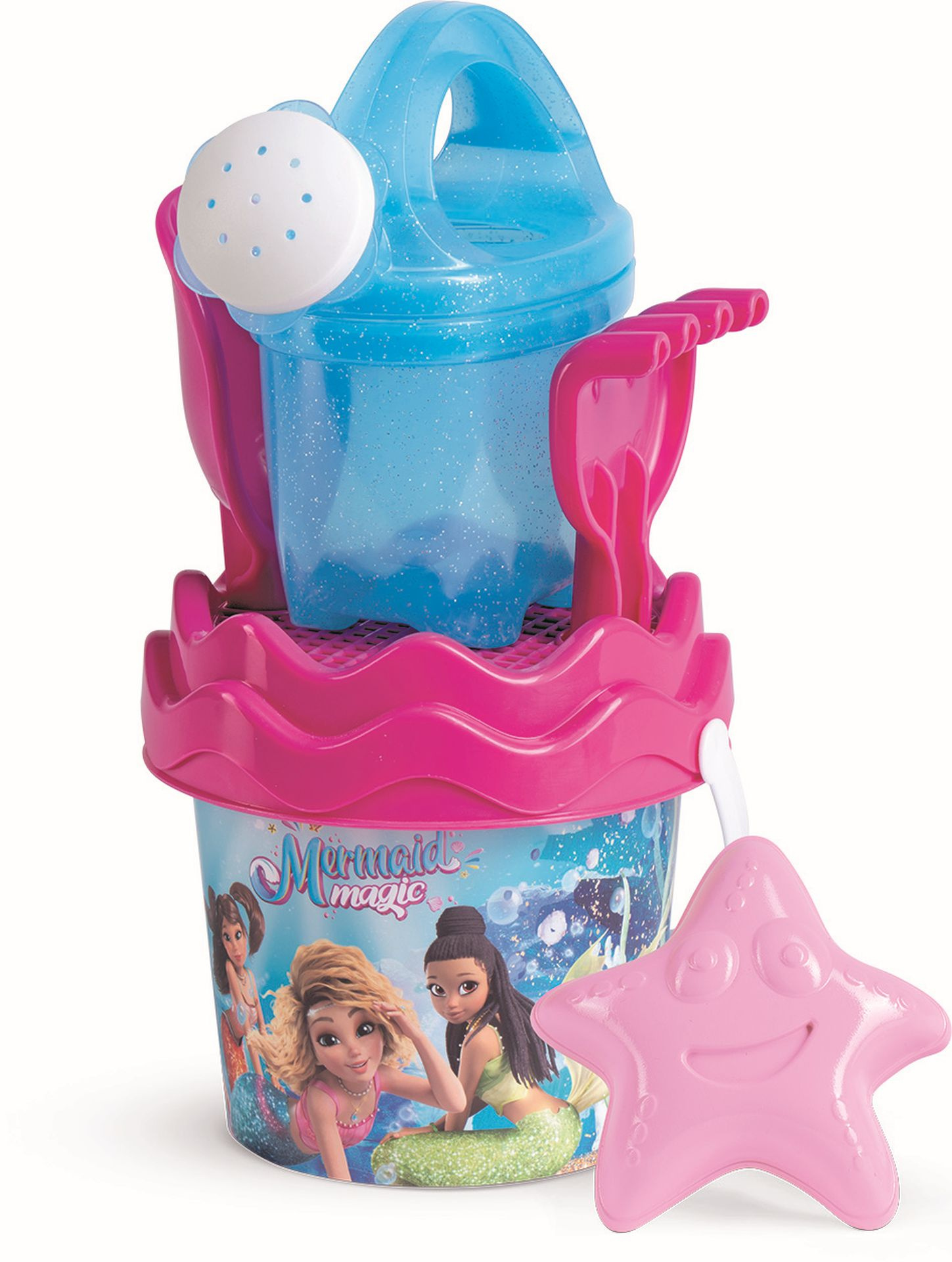 6dílná sada na písek, vyrobená z kvalitních recyklovaných plastů v Itálii. Obsahuje: Kyblík, konvičku se třpytkami 0,5 l, sítko, lopatku, hrabičky a tvořítko ve tvaru mořské hvězdice. Kyblík: průměr 13 cm, výška 11 cm. Sada: výška 27,5 cm, váha 0,244 kg. Doporučený věk od 10 měsíců.