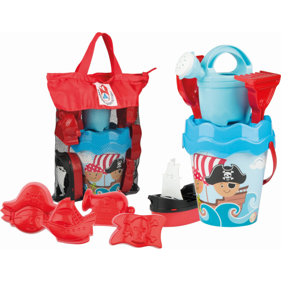 10dílná sada na písek, vyrobená z kvalitních plastů v Itálii. Obsahuje: Kyblík o průměru 17 cm, sítko, konvičku 0,5 l, lopatku a hrabičky, pirátskou loďku a 4 tvořítka s pirátskou tématikou. Vše je uložené v praktické cestovní síťované tašce. Rozměry balení: 28 x 11 x 34 cm (d x š x v). Váha sady: 0,64 kg. Doporučený věk od 12 měsíců. Výrobce, italská firma Androni Giocattoli sídlící nedaleko Milána, se specializuje na výrobu plastových hraček na písek a zahradu a také stavebnic UNICO Plus již od roku 1974. Jejím mottem je heslo: Androni Toys: Kvalita vyrobená v Itálii. Používané plasty jsou pevné, ale zároveň pružné a při běžném hraní nedochází k jejich praskání. Vydrží i větší zátěž a proto jsou výrobky vhodné i do školek, kde téměř denně procházejí zatěžkávací zkouškou.