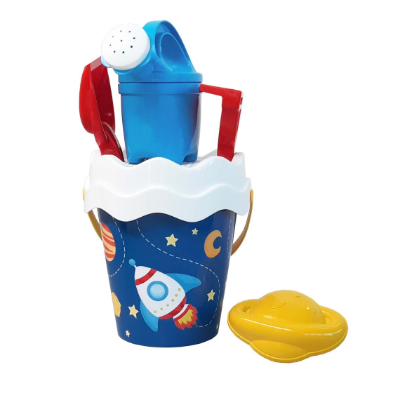 6dílná sada na písek, vyrobená z kvalitních plastů v Itálii. Obsahuje: Kyblík, konvičku 0,5 l, sítko, lopatku, hrabičky a tvořítko ve tvaru planetky. Kyblík: průměr 17 cm, výška 16 cm. Sada: výška 35 cm, váha 0,342 kg. Doporučený věk od 12 měsíců.