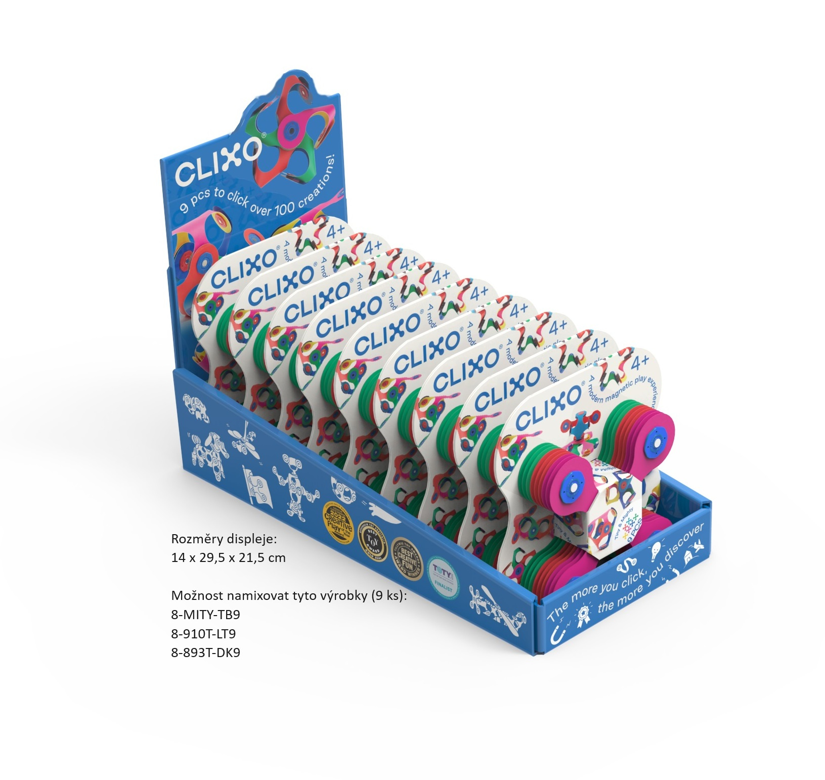 CLIXO Tiny & Mighty - 9 kusů je flexibilní, velmi lehká, magnetická stavebnice ze syntetického papíru, ve všech barvách duhy, která je inspirována origami a zároveň je to skvělá Montessori hračka. Tato stavebnice je založena na principu spojování různých tvarů a dílků přichycením červených a modrých magnetů k sobě. Sada Tiny & Mighty umožňuje postavit až 100 různých staveb a stavět takové kombinace, jako je například most, had, housenka, větrník, náramek, miska nebo kutálející se míček. Inspirace pro různé stavby naleznete uvnitř papírového balení. V tomto zázračném balení kapesní velikosti se skrývá svět zábavných objevů! Tato sada se skvěle hodí i jako doplněk k jakékoliv jiné sadě.