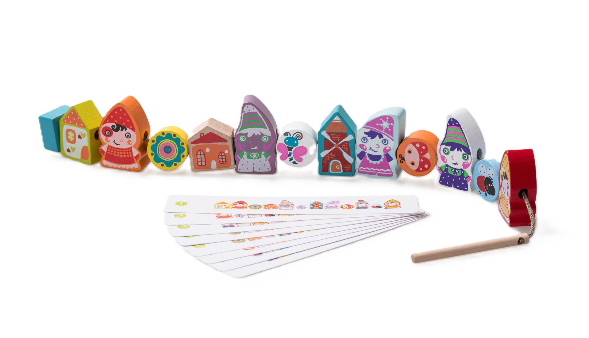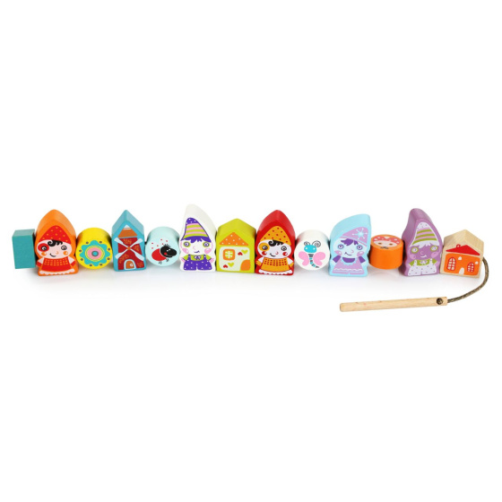 Popis CUBIKA 13654 Navlékací trpaslíci - navlékací set - 13 dřevěných dílů a 8 předloh
