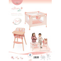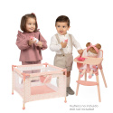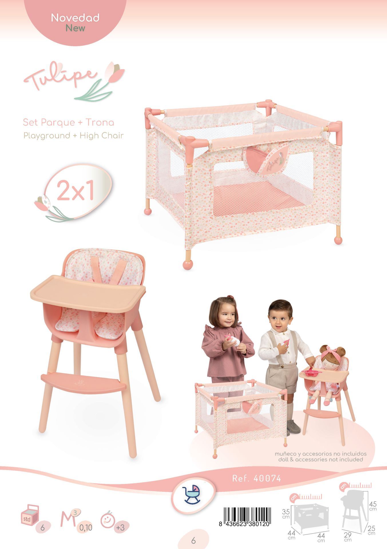 DeCuevas 40074 Nábytkový set pro panenky 2 v 1 Tulipe 2025 ze stejnojmenné kolekce, která je novinkou roku 2025, je díky svým jemným pastelovým barvám krásným doplňkem dívčího pokojíčku a potěší jistě každou malou slečnu. Sada se skládá z hrací ohrádky pro panenky, které si také rády hrají a chtějí mít své místečko k odpočinku, a jídelní židličky pro panenky, která je skvělým pomocníkem při krmení. Tulipe je, jak již sám název napovídá, kolekce plná tulipánů v překrásně sladěných teplých pastelových lososových barvách. Světlejší a tmavší odstíny barev jsou vkusně doplněné drobným květinovým vzorem ve stejných tónech na bílosmetanovém podkladu. Tento motiv ještě navíc u kočárků umocňují svým tematickým tvarem i překrásné, jako tulipán vypadající tašky. Květ tulipánu zdobí i dřevěné výrobky této kolekce. Tato kolekce nabízí výběr výrobků od jídelních sad přes postýlky a kočárky až po dřevěný nábytek pro panenky. Nádherný španělský design, precizní zpracování. Velmi snadná manipulace během samotné hry. Materiál: kov, plast, textil. Baleno v krabici v barvách kolekce. Doporučený věk od 3 let.