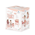 DeCuevas 40074 Nábytkový set pro panenky 2 v 1 Tulipe 2025 patří do stejnojmenné kolekce, která je novinkou roku 2025 a nabízí výběr výrobků od jídelních sad přes postýlky a kočárky až po dřevěný nábytek pro panenky. Tulipe je, jak již sám název napovídá, kolekce plná tulipánů v překrásně sladěných teplých pastelových lososových barvách. Světlejší a tmavší odstíny barev jsou vkusně doplněné drobným květinovým vzorem ve stejných tónech na bílosmetanovém podkladu. Tento motiv ještě navíc u kočárků umocňují svým tematickým tvarem i překrásné, jako tulipán vypadající tašky. Květ tulipánu zdobí i dřevěné výrobky této kolekce.