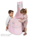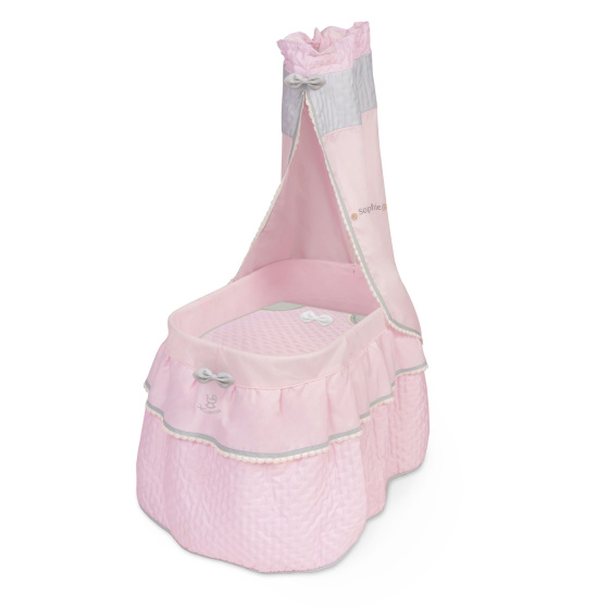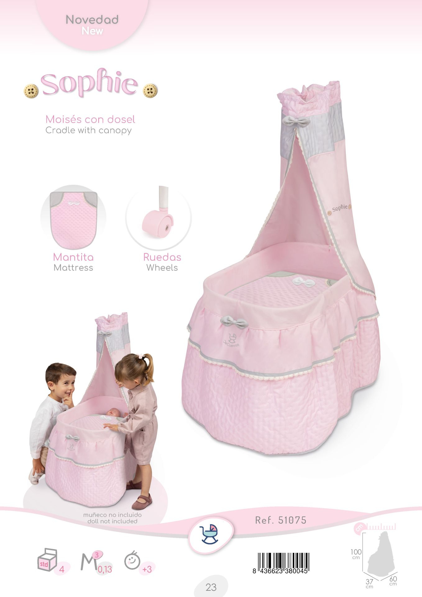 DeCuevas 51075 Pojízdná postýlka pro panenky s nebesy a peřinkou Sophie 2025 patří do stejnojmenné kolekce, která je novinkou roku 2025 a nabízí nejen zmíněné kočárky, ale i jiné doplňky pro malé slečny a jejich panenky. Něžná dívčí kolekce Sophie je nepřehlédnutelná pro každé děvčátko. Světle růžová barva dominuje celé kolekci. Doplněná je o světle šedivé a bílé kraječky a mašličky, které zdobí všechny výrobky této rozmanité kolekce a ještě více podtrhují nádech romantiky.