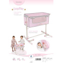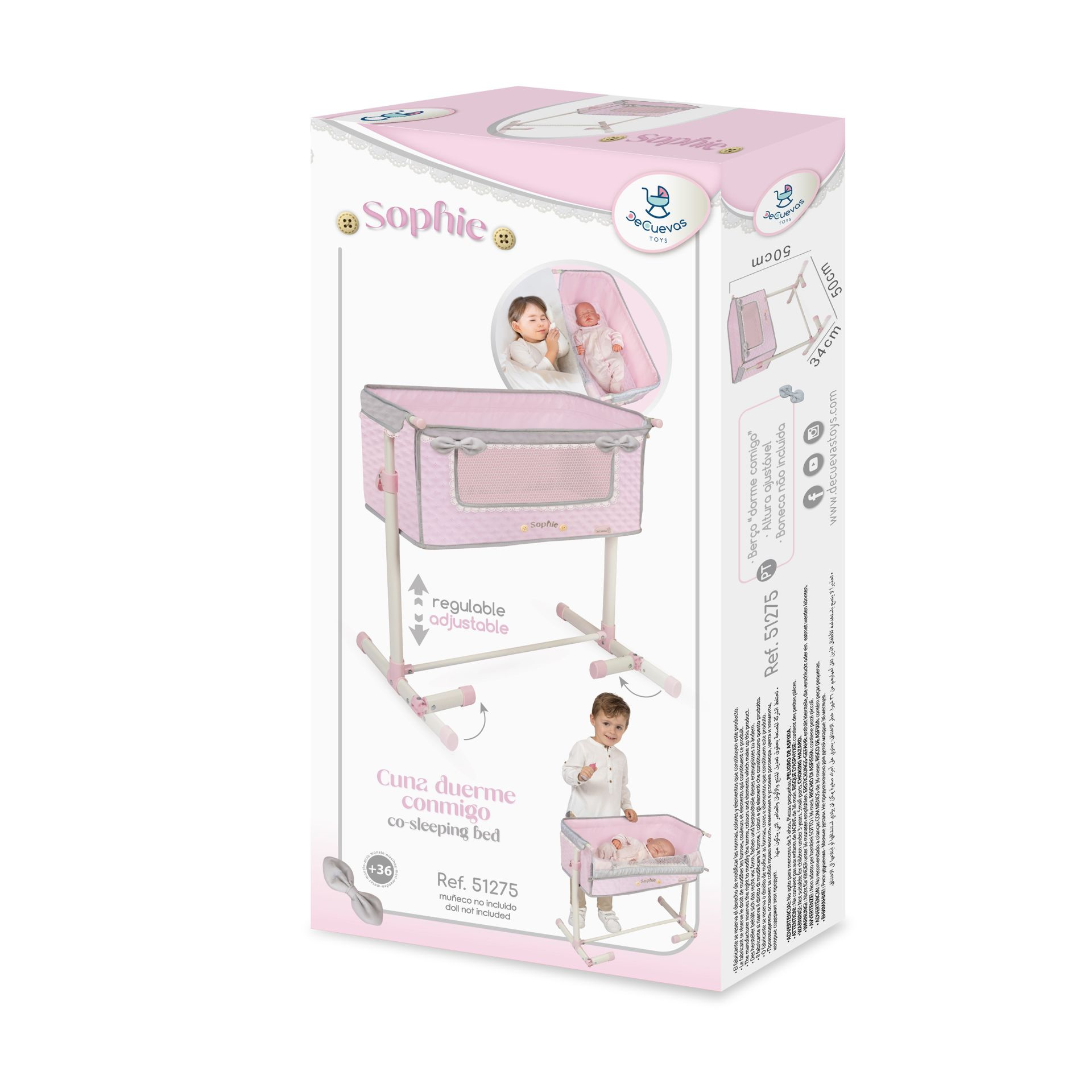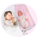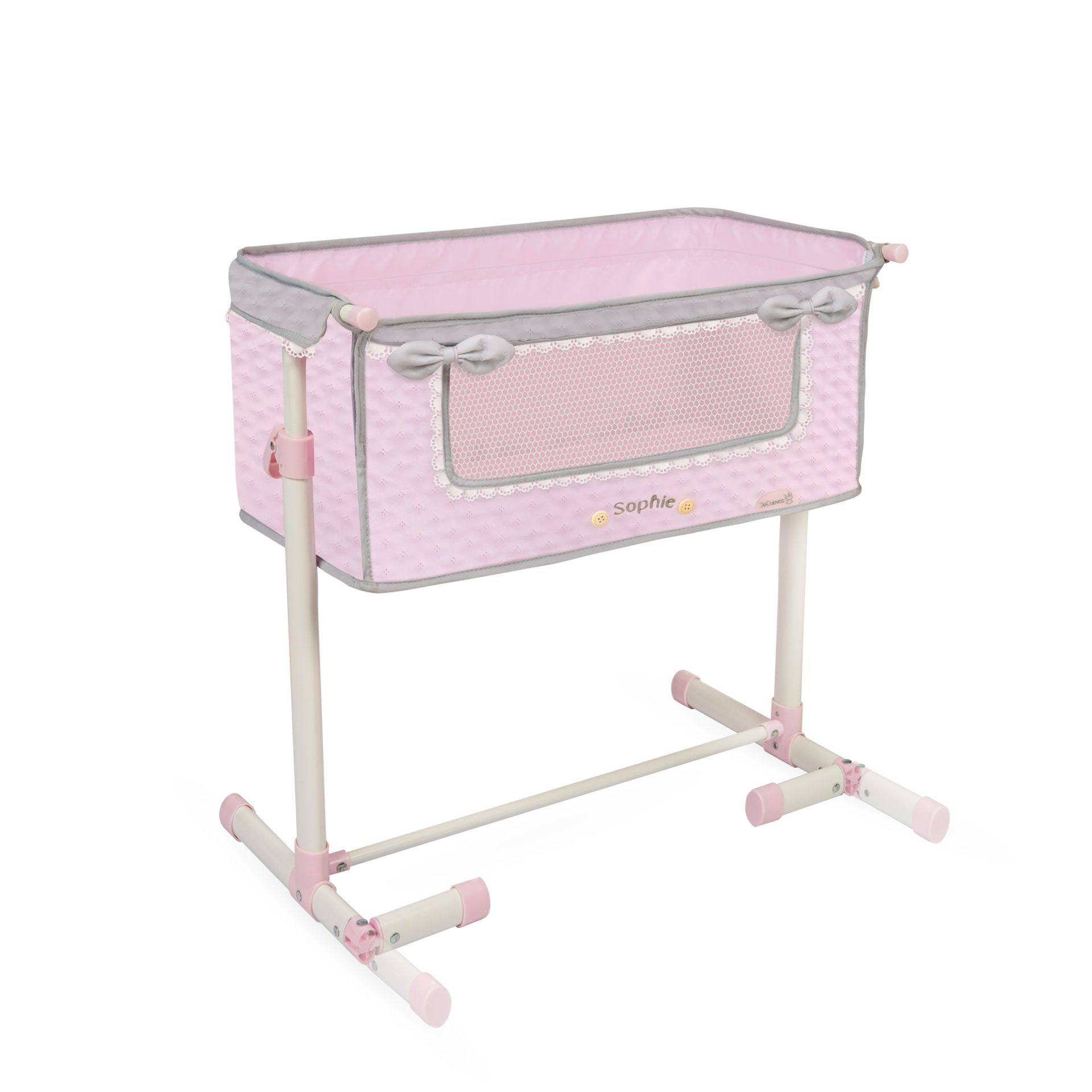 DeCuevas 51275 Novorozenecká postýlka pro panenky s funkcí společného spaní Sophie 2025 patří do stejnojmenné kolekce, která je novinkou roku 2025 a nabízí nejen zmíněné kočárky, ale i jiné doplňky pro malé slečny a jejich panenky. Něžná dívčí kolekce Sophie je nepřehlédnutelná pro každé děvčátko. Světle růžová barva dominuje celé kolekci. Doplněná je o světle šedivé a bílé kraječky a mašličky, které zdobí všechny výrobky této rozmanité kolekce a ještě více podtrhují nádech romantiky.