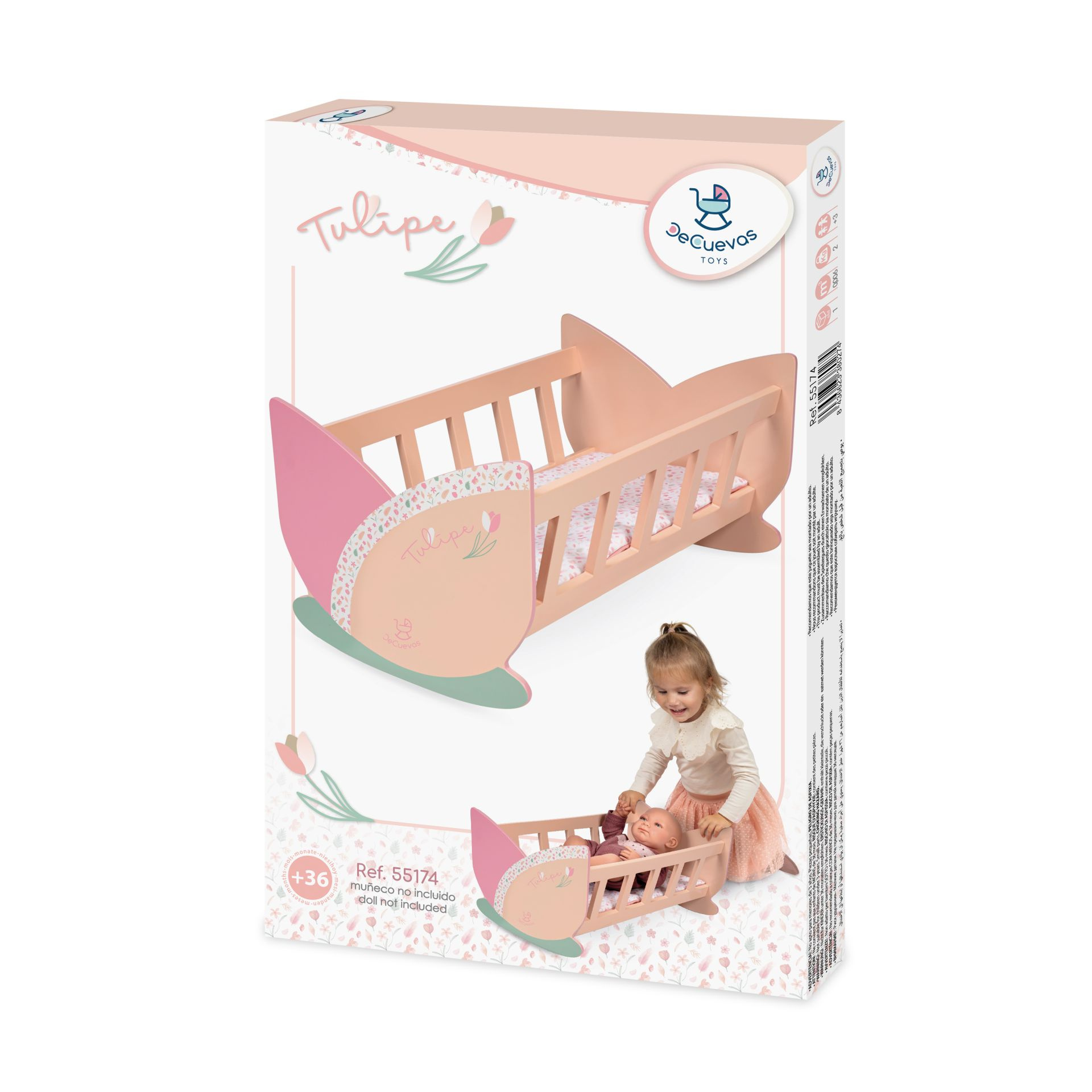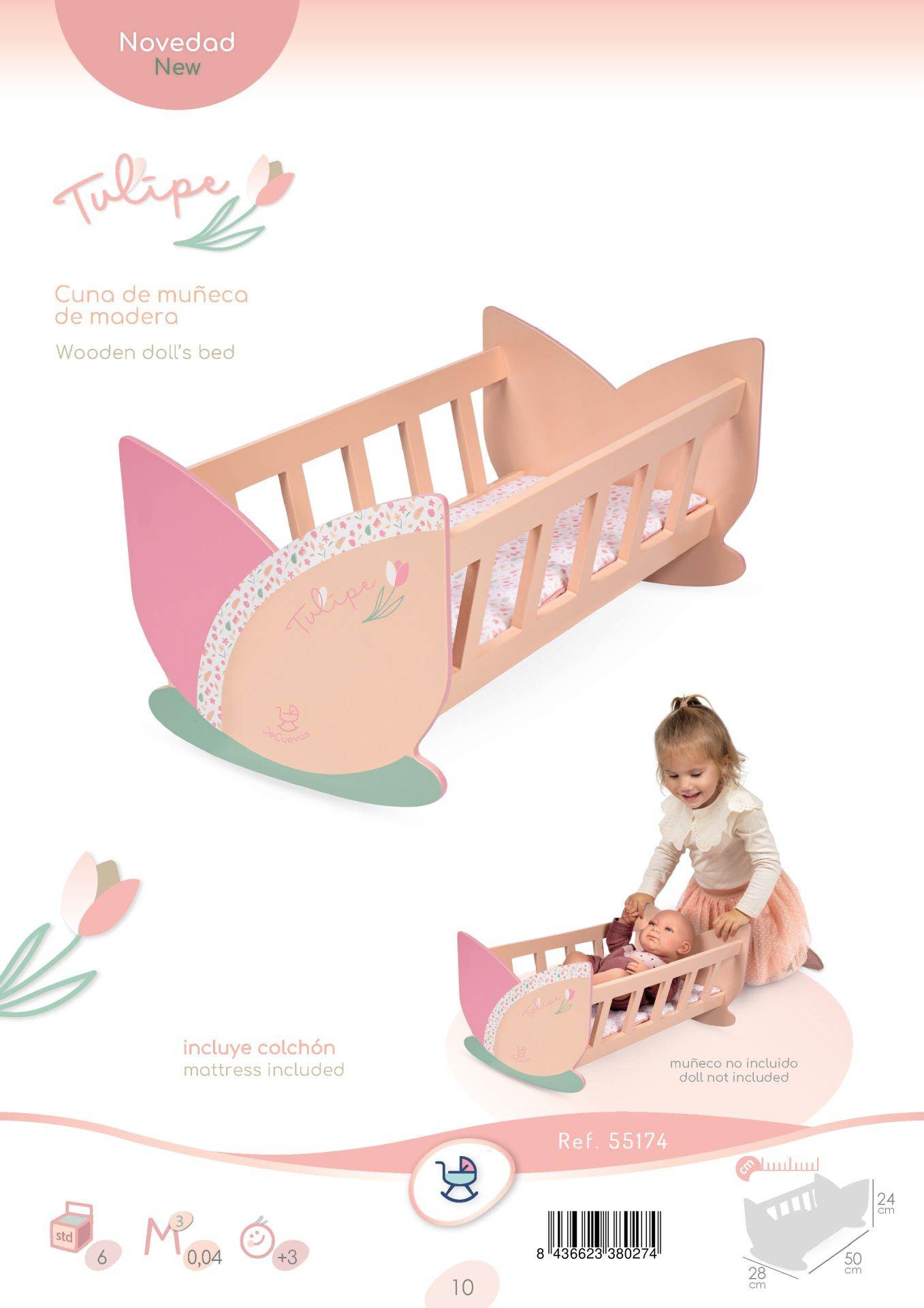 DeCuevas 55174 Dřevěná kolébka pro panenky Tulipe 2025 patří do stejnojmenné kolekce, která je novinkou roku 2025 a nabízí výběr výrobků od jídelních sad přes postýlky a kočárky až po dřevěný nábytek pro panenky. Tulipe je, jak již sám název napovídá, kolekce plná tulipánů v překrásně sladěných teplých pastelových lososových barvách. Světlejší a tmavší odstíny barev jsou vkusně doplněné drobným květinovým vzorem ve stejných tónech na bílosmetanovém podkladu. Tento motiv ještě navíc u kočárků umocňují svým tematickým tvarem i překrásné, jako tulipán vypadající tašky. Květ tulipánu zdobí i dřevěné výrobky této kolekce.