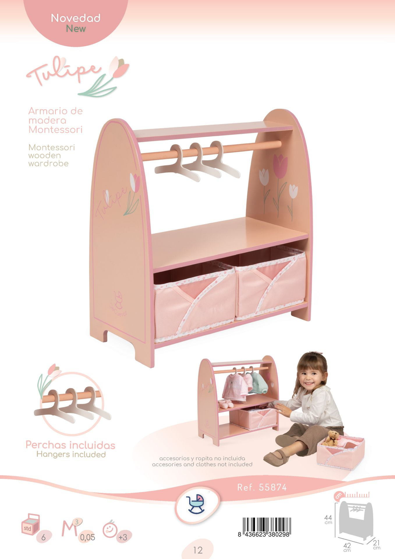 DeCuevas 55874 Dřevěný šatní věšák na oblečení pro panenky Tulipe 2025 ze stejnojmenné kolekce, která je novinkou roku 2025, je díky svým jemným pastelovým barvám krásným doplňkem dívčího pokojíčku a potěší jistě každou malou slečnu. Šatní tyč s ramínky poskytne dostatek prostoru pro uložení oblečků a různých doplňků pro panenky. Tyč je určena pro oblečky o délce max. 19 cm. Mnoho věcí se krásně schová i do dvou úložných košíků. Tulipe je, jak již sám název napovídá, kolekce plná tulipánů v překrásně sladěných teplých pastelových lososových barvách. Světlejší a tmavší odstíny barev jsou vkusně doplněné drobným květinovým vzorem ve stejných tónech na bílosmetanovém podkladu. Tento motiv ještě navíc u kočárků umocňují svým tematickým tvarem i překrásné, jako tulipán vypadající tašky. Květ tulipánu zdobí i dřevěné výrobky této kolekce. Tato kolekce nabízí výběr výrobků od jídelních sad přes postýlky a kočárky až po dřevěný nábytek pro panenky. Nádherný španělský design, precizní zpracování. Materiál: MDF, masivní dřevo, kov. Baleno v krabici v barvách kolekce. Doporučený věk od 3 let.