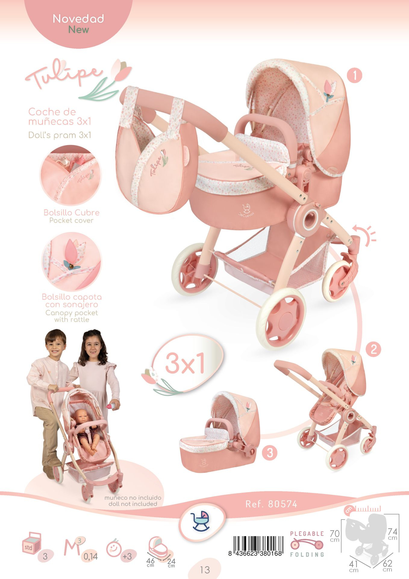 DeCuevas 80574 Skládací kočárek pro panenky 3 v 1 s taškou Tulipe 2025 - 70 cm patří do stejnojmenné kolekce, která je novinkou roku 2025 a nabízí výběr výrobků od jídelních sad přes postýlky a kočárky až po dřevěný nábytek pro panenky. Tulipe je, jak již sám název napovídá, kolekce plná tulipánů v překrásně sladěných teplých pastelových lososových barvách. Světlejší a tmavší odstíny barev jsou vkusně doplněné drobným květinovým vzorem ve stejných tónech na bílosmetanovém podkladu. Tento motiv ještě navíc u kočárků umocňují svým tematickým tvarem i překrásné, jako tulipán vypadající tašky. Květ tulipánu zdobí i dřevěné výrobky této kolekce.