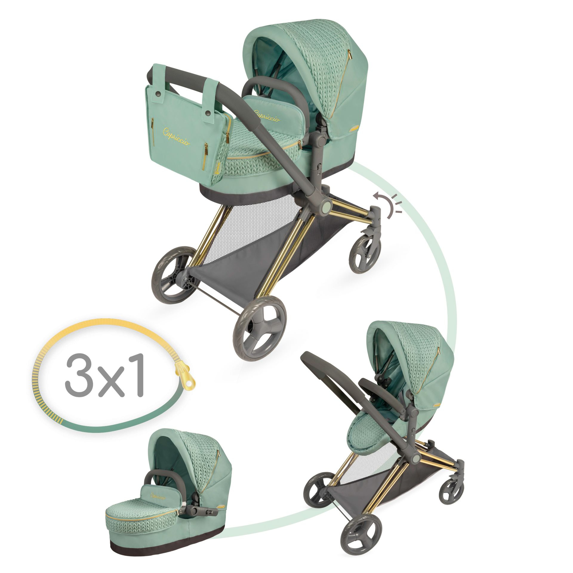 DeCuevas 81773 Skládací kočárek pro panenky 3 v 1 s taškou Capriccio 2025 - 73 cm patří do stejnojmenné kolekce, která je novinkou roku 2025 a nabízí luxusní kočárky pro malé slečny a jejich panenky. Tato úžasná kolekce Capriccio není nová jen svou nezaměnitelnou moderní mentolově zelenou barvou, ale také svým zdobným zpracováním. Jedná se o imitaci úpletu rafinovaně kombinovaného s hladkou moderní látkou. Rám a podvozek kočárků tvoří tmavě šedá se zlatými prvky, které jsou vkusně uplatněny v podobě zlatých zipů a výšivky Capriccio na textilní části kočárků a doplňkové tašce.