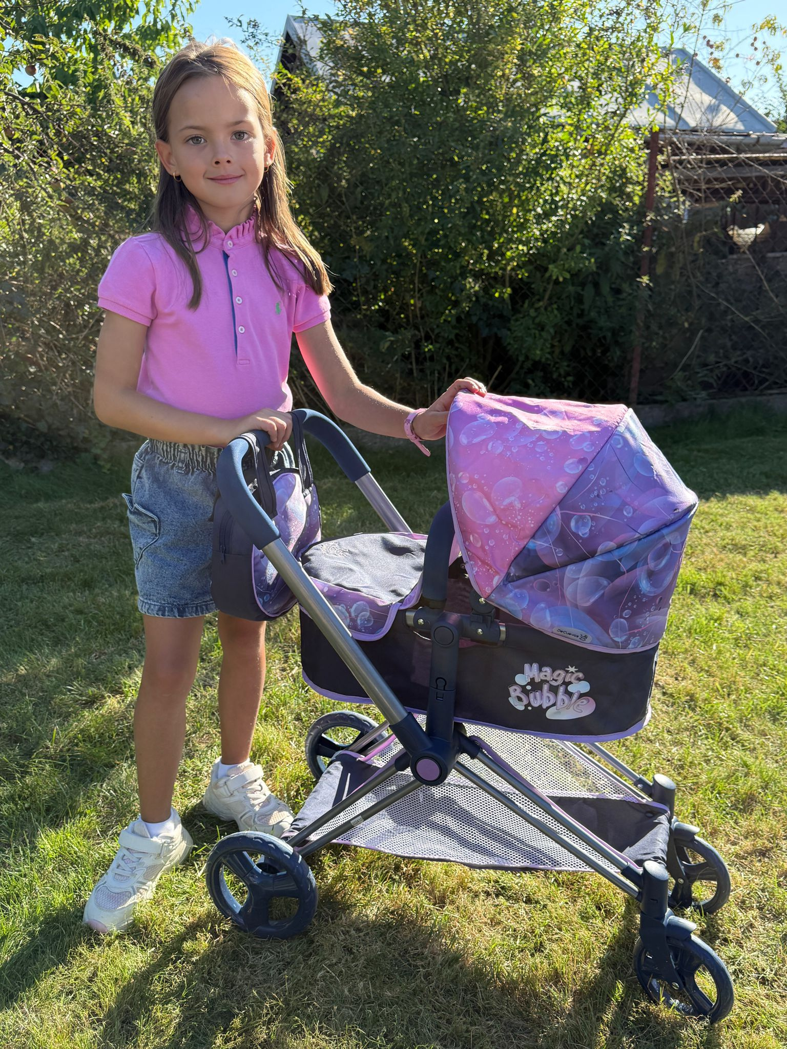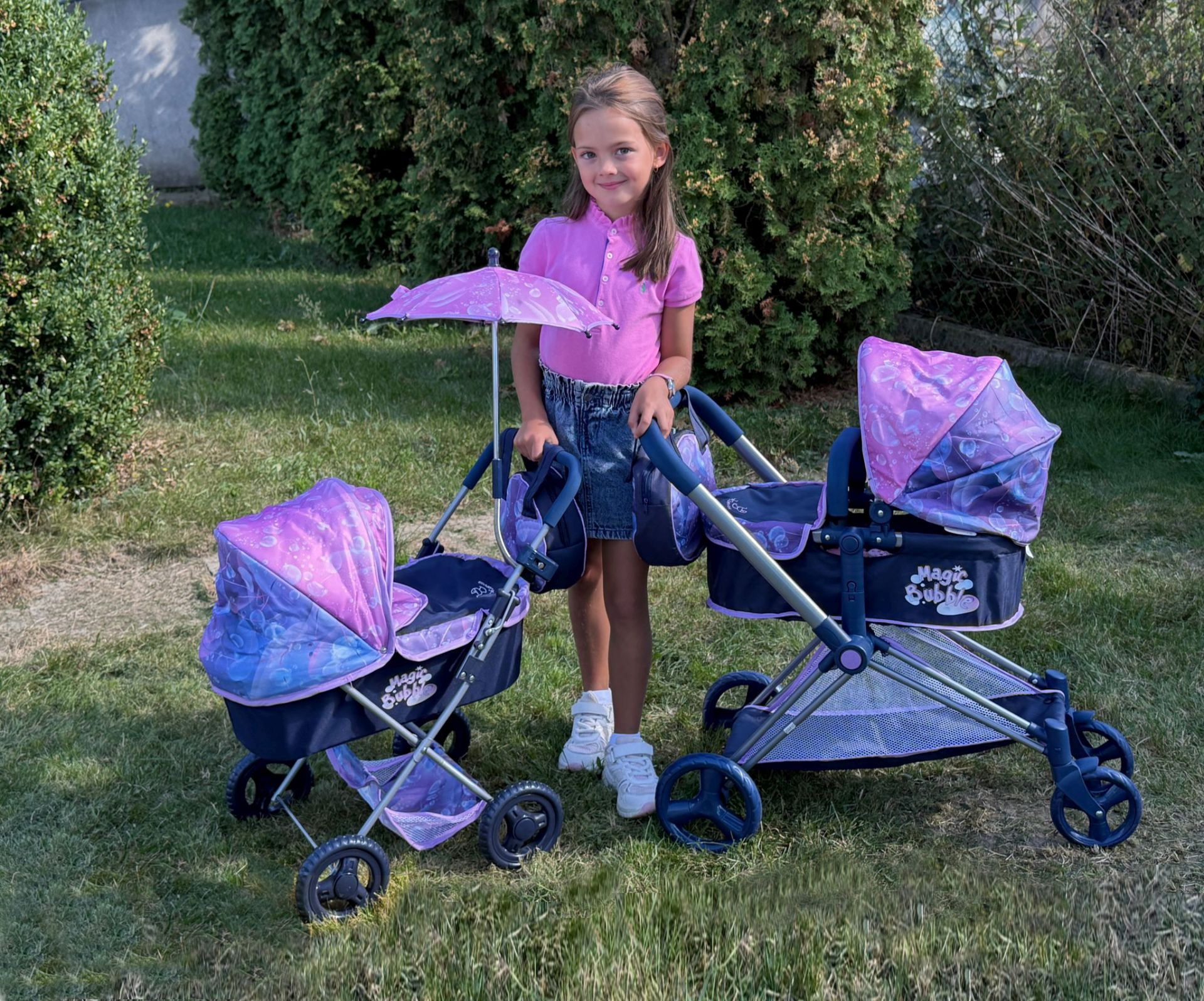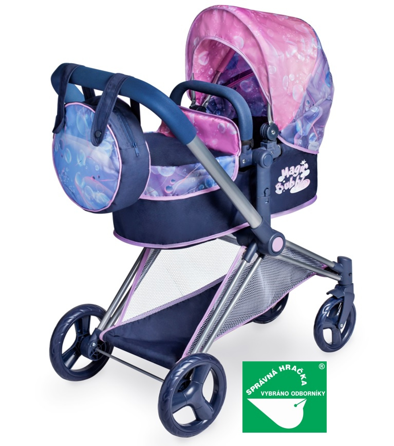 DeCuevas 81776 Skládací kočárek pro panenky 3 v 1 s taškou Magic Bubble 2024 - 73 cm patří do stejnojmenné kolekce, která je novinkou roku 2024 a nabízí několik různých druhů kočárků. Barevná kolekce Magic Bubble pracuje s něžným duhovým efektem. Od růžové plynule přechází ve světle fialovomodrou, aby v závěru končila královskou modří. Hravé bublinky provázejí celou kolekci. Kulatá závěsná taška na kočárek, jak tvarem, tak designem, podporuje název celé kolekce Magic Bubble. Aplikace tematického Magic Bubble loga výrazně vyniká a zdobí na tmavomodrém pozadí materiálu. Tato kolekce se zrodila ve spolupráci českých návrhářů a španělského výrobce DeCuevas Toys.