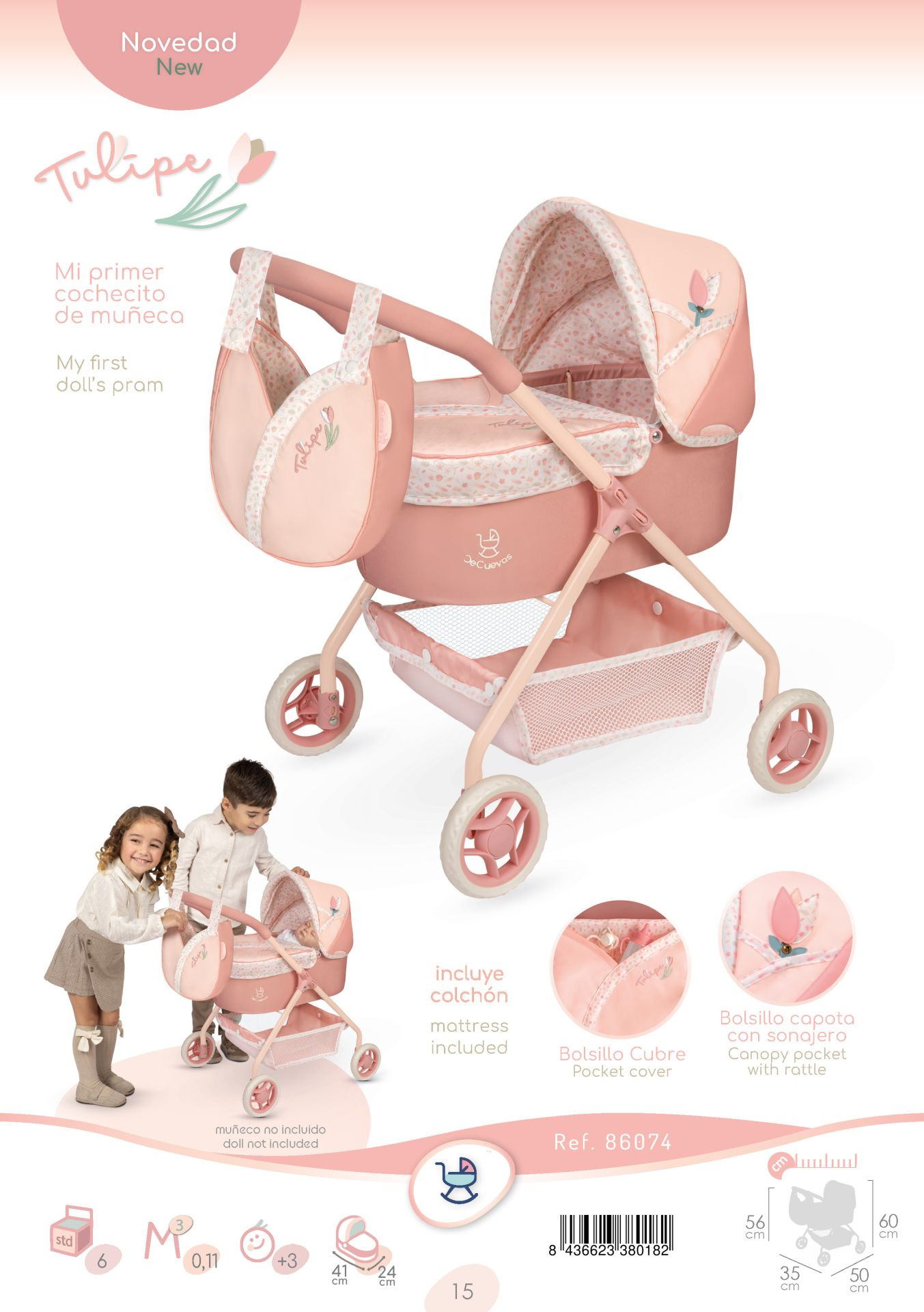 DeCuevas 86074 Můj první kočárek pro panenky s taškou Tulipe 2025 - 56 cm ze stejnojmenné kolekce, která je novinkou roku 2025, je díky stabilní konstrukci a nízké rukojeti a váze vhodný především pro úplně malé slečny. Tulipe je, jak již sám název napovídá, kolekce plná tulipánů v překrásně sladěných teplých pastelových lososových barvách. Světlejší a tmavší odstíny barev jsou vkusně doplněné drobným květinovým vzorem ve stejných tónech na bílosmetanovém podkladu. Tento motiv ještě navíc u kočárků umocňují svým tematickým tvarem i překrásné, jako tulipán vypadající tašky. Květ tulipánu zdobí i dřevěné výrobky této kolekce. Tato kolekce nabízí výběr výrobků od jídelních sad přes postýlky a kočárky až po dřevěný nábytek pro panenky. Nádherný španělský design, precizní zpracování. Velmi snadná manipulace během samotné hry. Materiál: kov, plast, textil. Baleno v krabici v barvách kolekce. Doporučený věk od 3 let.