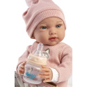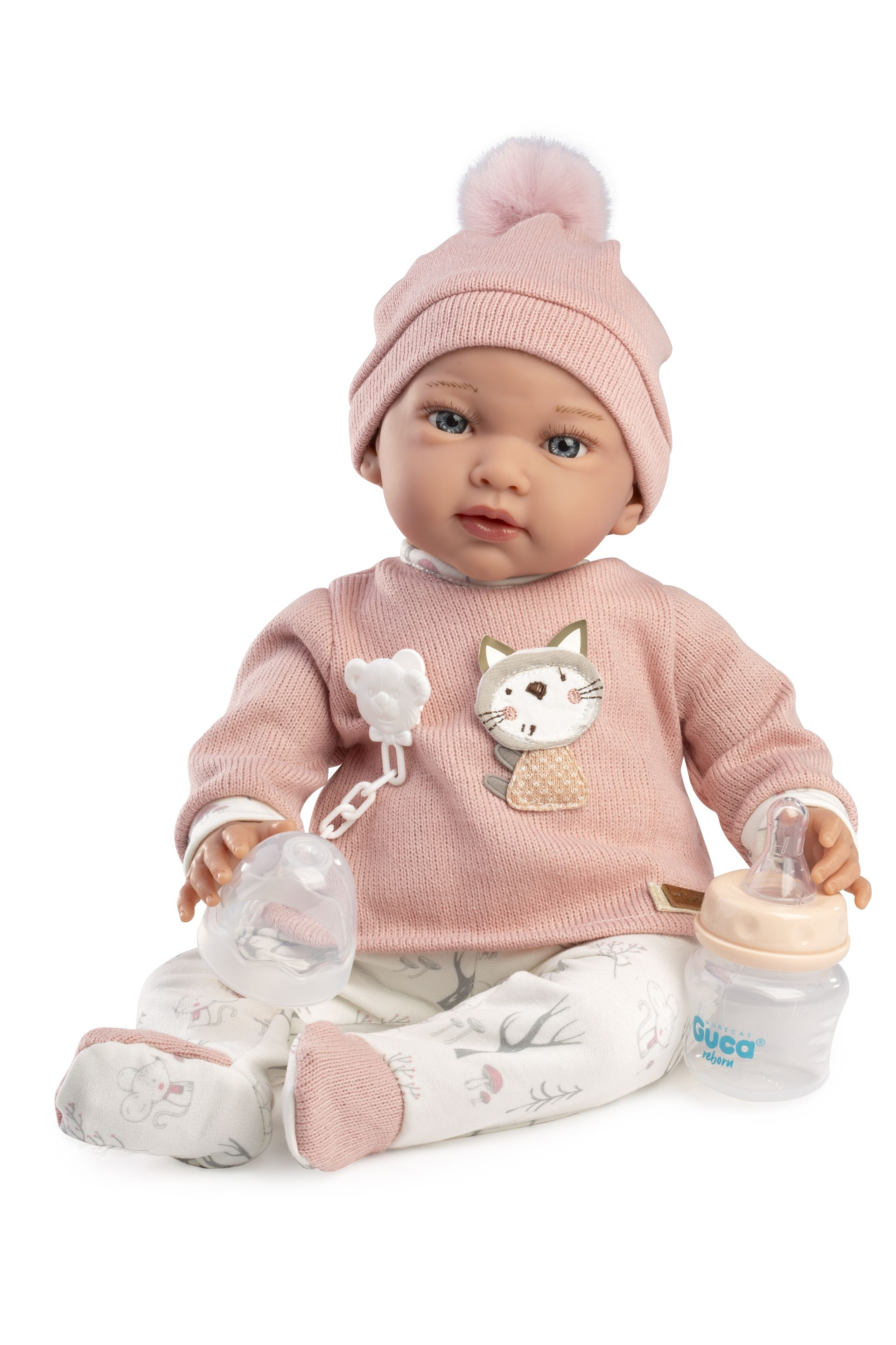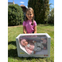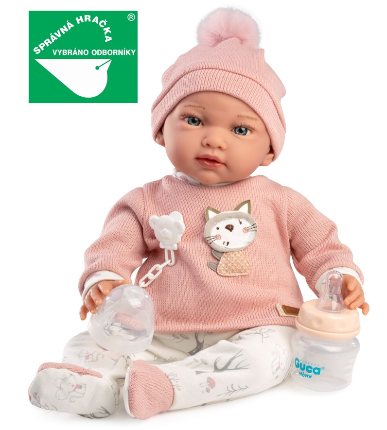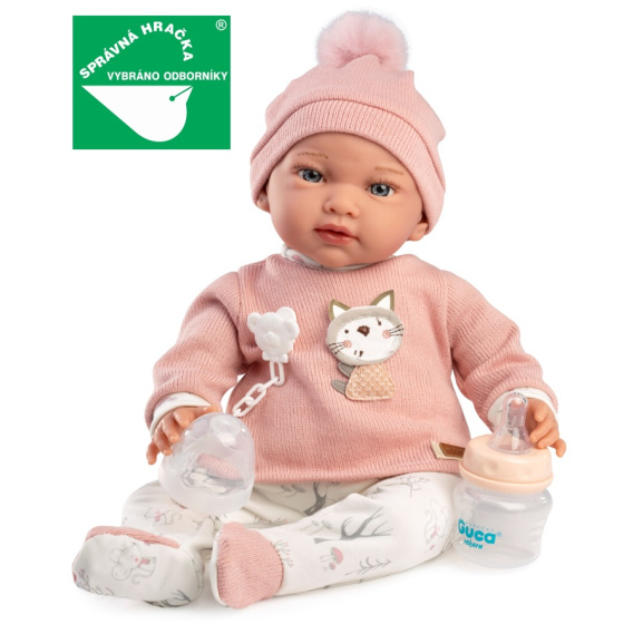 Zátěžová panenka miminko bez zvuku s měkkým látkovým tělem. Ruce a nohy jsou k tělu přichyceny kloubem. Miminko je polohovací a může i sedět, avšak díky zatížení hlavičky jsou její pohyby odlišné od ostatních miminek. Hlavička se jí na krku pohybuje v závislosti na celkové manipulaci s panenkou a v náručí se chová jako skutečné miminko, kterému je potřeba hlavičku ještě přidržovat. Díky zátěžovým výplním v hlavě a na zadečku má tento typ panenky miminka vyšší váhu oproti ostatním (cca 1800 g) a je vnímána jako manipulační panenka, která je vhodná nejen pro děti, ale i pro seniory nebo jako pomůcka pro inkluzi a osoby se speciálními potřebami. Tyto panenky se používají v ergoterapii, kde pomáhají rozvíjet jemnou motoriku a koordinaci u dětí i dospělých. Jsou také výborným pomocníkem při práci s lidmi s demencí, kde navozují klientům pocity klidu a bezpečí. Zátěžová výplň panenky: látkové pytlíky plněné křemičitým pískem. Velikost 42 cm. Ručně vyrobeno ve Španělsku, baleno v dárkové krabici. Doporučený věk od 3 let.