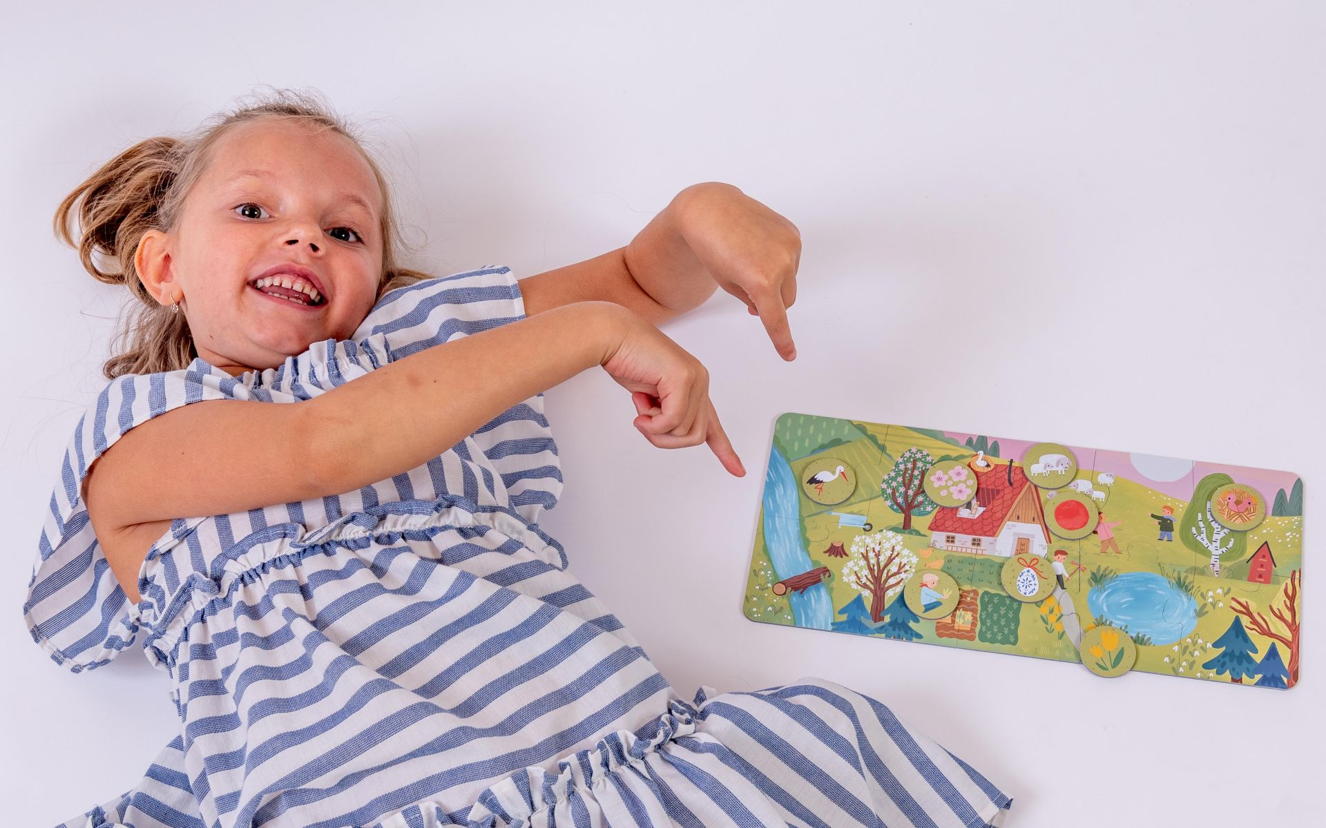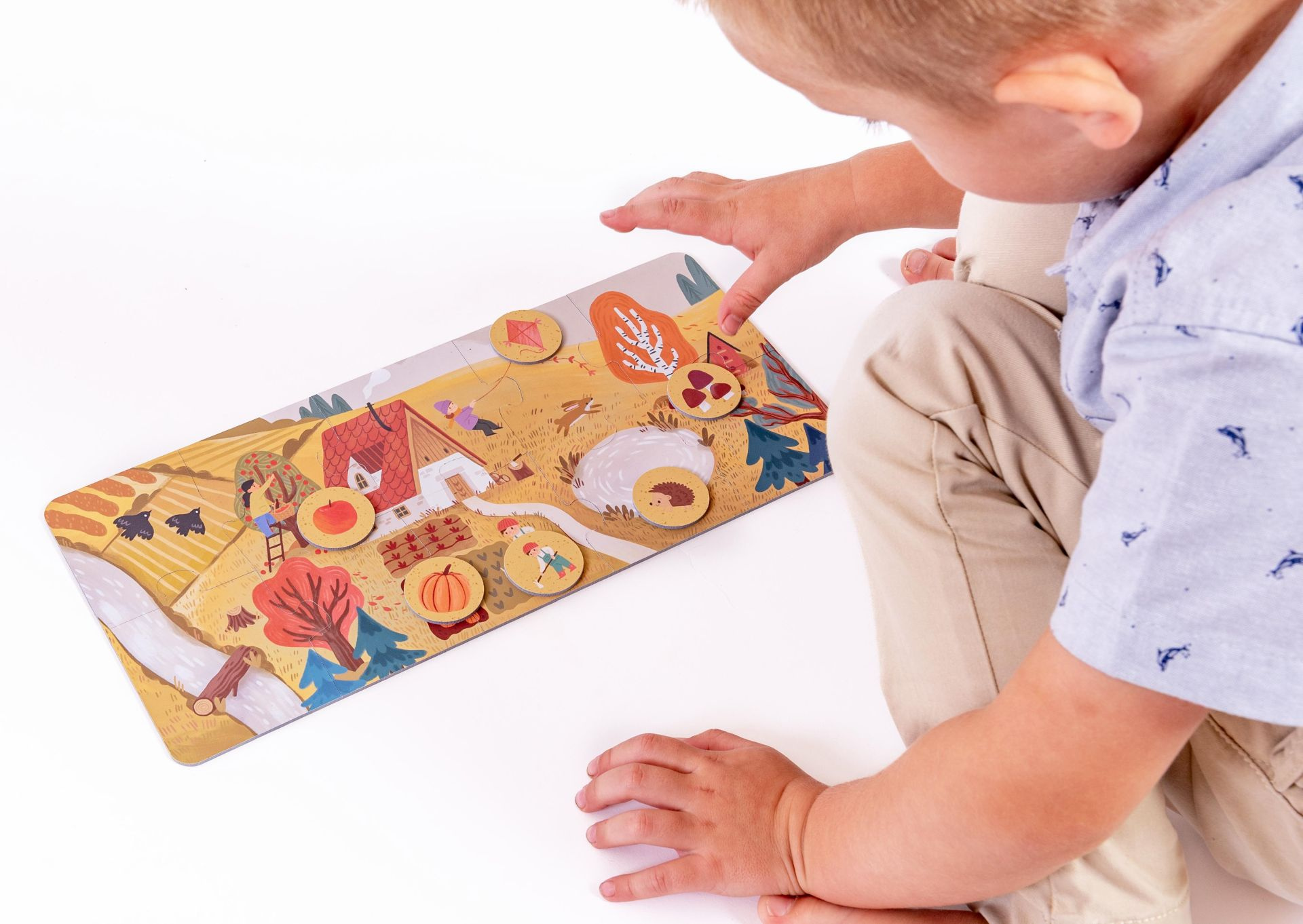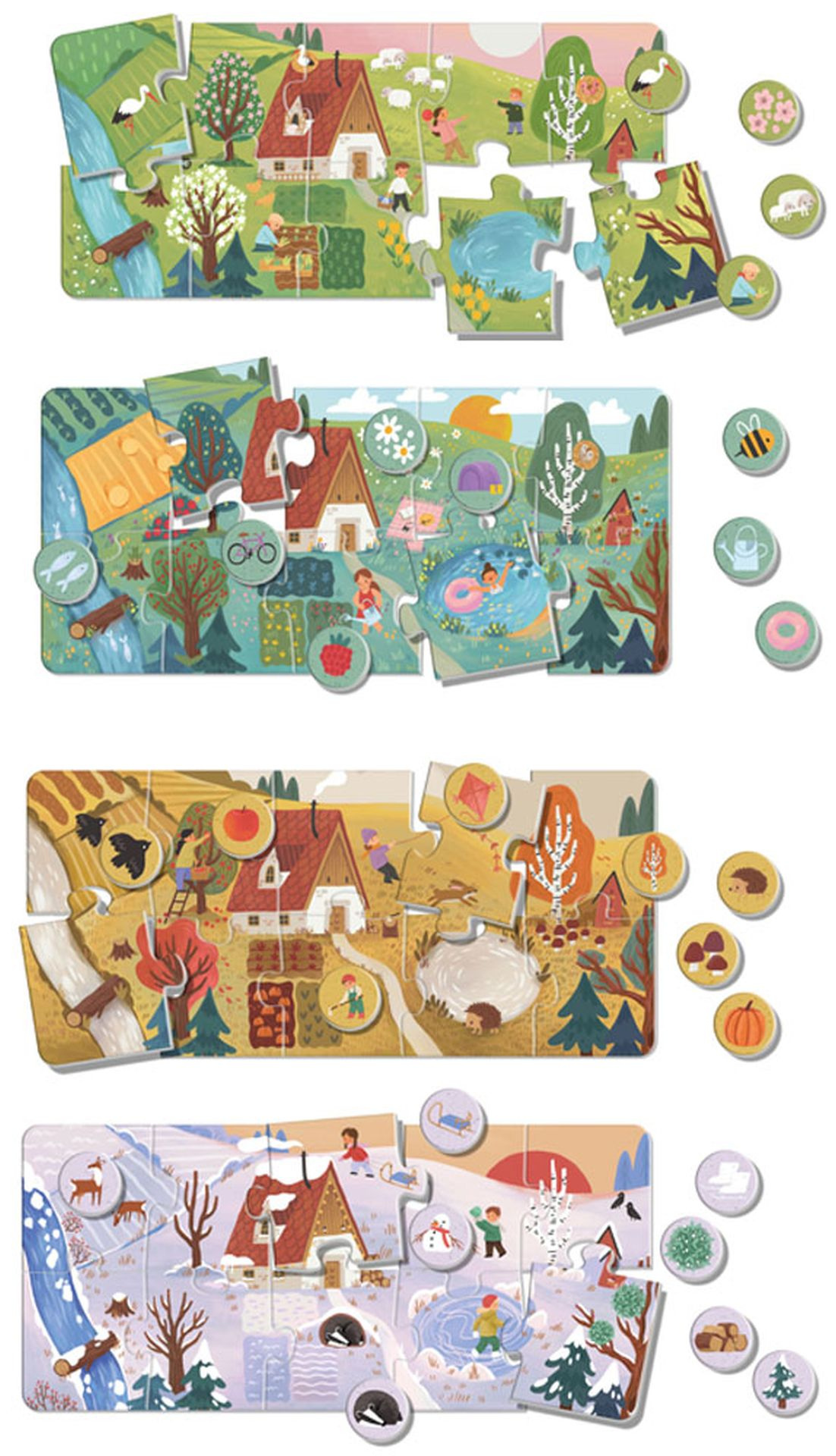 Tato hra přináší čtyři krásné scény: jaro, léto, podzim a zimu. Každé období děti skládají z 10 velkých dílků a k hotovým obrázkům přiřazují 8 kulatých žetonů s motivy z daného ročního období – trénují tak postřeh i logické myšlení. Hra využívá principy Montessori – děti samostatně objevují, kombinují a propojují prvky podle smyslového vnímání. Extra velké dílky z 2mm FSC kartonu se snadno drží i těm nejmenším.