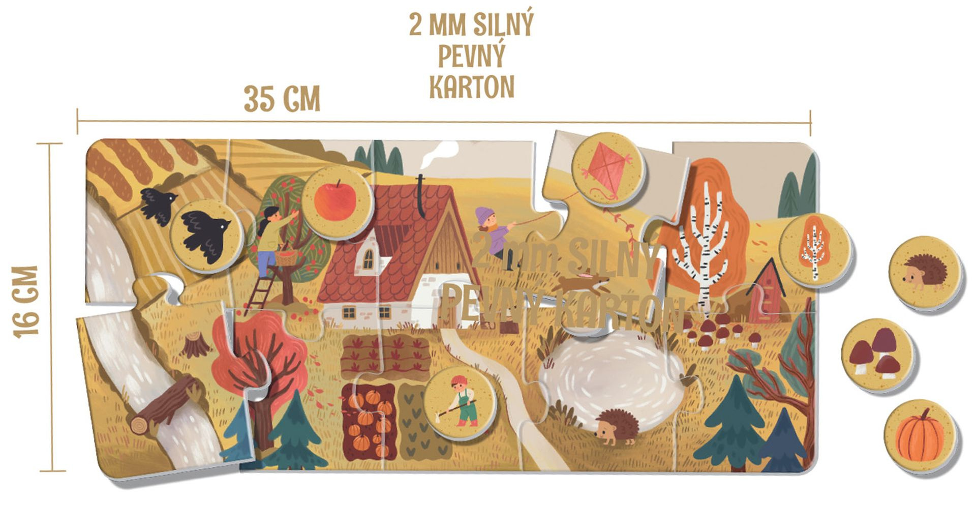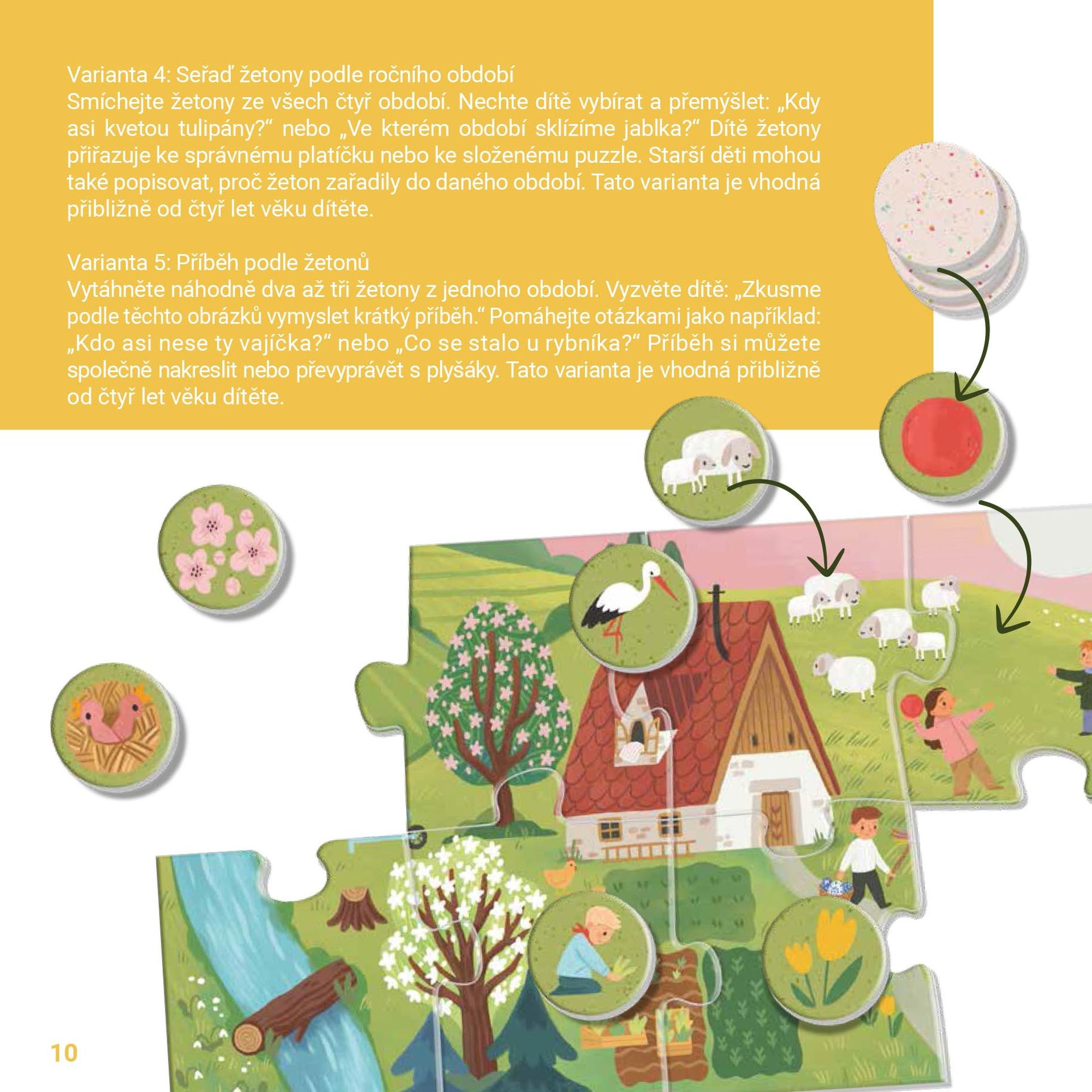 Čtyři roční období jako velké obrázkové puzzle pro děti od 2 let. Každé období tvoří velké puzzle o 10 dílcích (35 × 16 cm) a 8 tematických žetonů (Ø 3,5 cm) s detaily – dítě je hledá, přiřazuje a třídí k jednotlivým puzzle. Montessori přístup rozvíjí postřeh a logické myšlení. Extra velké dílky z 2 mm silného a pevného kartonu. Součástí jsou rady pro rodiče s náměty na mnoho herních variant, které podporují fantazii a komunikaci. Doporučený věk od 2–6 let. Vyrobeno v České republice ve spolupráci s pedagogy.