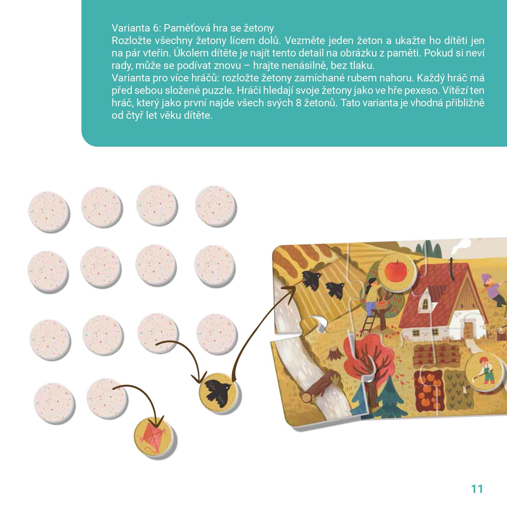 Žetony s detaily. Součástí jsou čtyři plátíčka – každé patří k jednomu ročnímu období a obsahuje osm obrázkových žetonů s typickými detaily (např. sněhulák, motýl, houby, včely). V radách pro rodiče najdete 4 herní varianty, jak žetony i puzzle využít (třídění podle období, hledání detailů, vyprávění příběhů aj.).