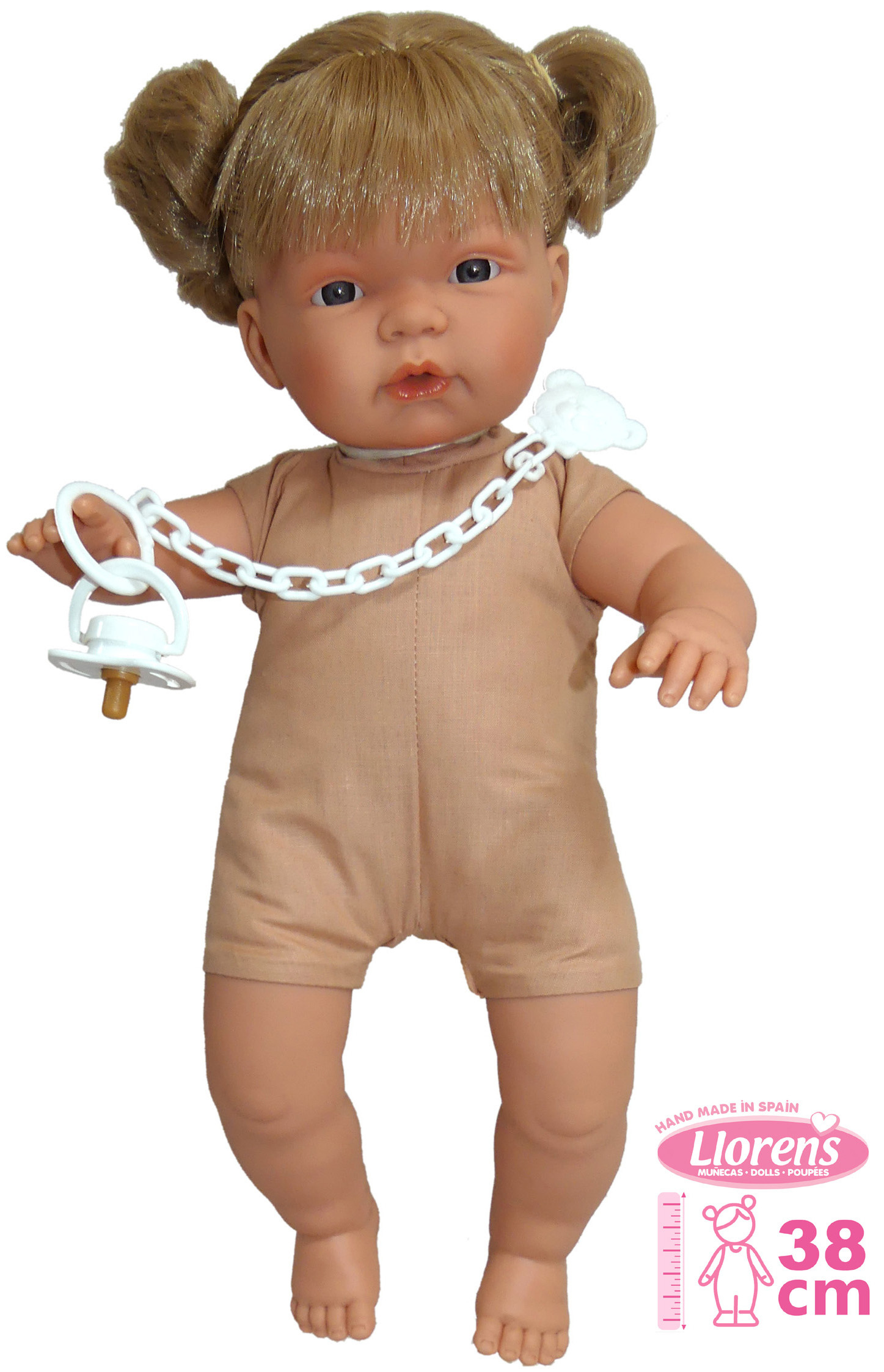 Mluvící a plačící panenka (po vyjmutí pojistky ihned funkční) s měkkým látkovým tělem a s vlásky po celé hlavě. Hlava a končetiny jsou vyrobené z kvalitního měkčeného vinylu. Po vytažení dudlíku z úst začne panenka říkat „mama“, „papa“ a vydávat reálný zvuk plačícího dítěte, který lze utišit opět magnetickým dudlíkem. Velikost panenky 38 cm. Ručně vyrobeno ve Španělsku, baleno v igelitovém obalu. Doporučený věk od 3 let. Tento model je bez oblečení a proto doporučujeme k panence dokoupit originální oblečení z nabídky Llorens pro panenky velikosti 38 cm. Součástí balení je 3 x knoflíková baterie LR44 s návodem na její výměnu. Baterie jsou spotřební zboží a proto jejich vybití není důvodem k reklamaci panenky.