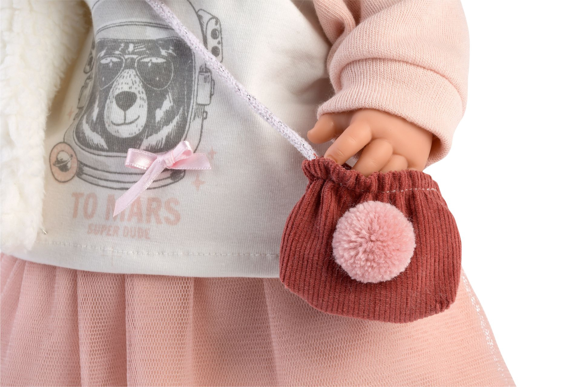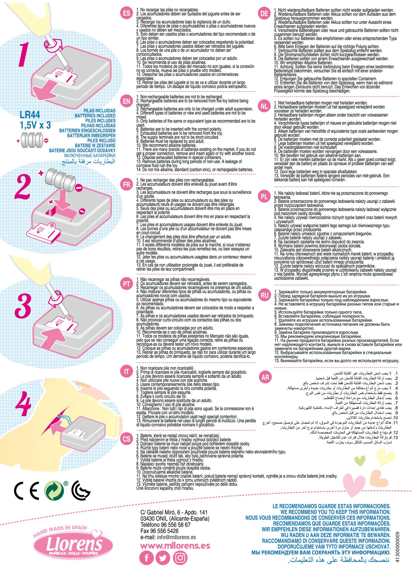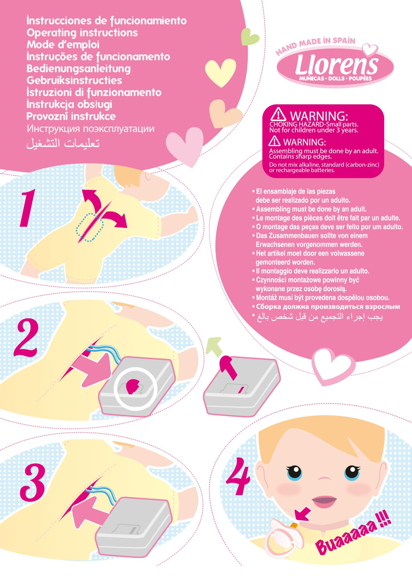 Mluvící a plačící panenka (po vyjmutí pojistky ihned funkční) s měkkým látkovým tělem a s vlásky po celé hlavě. Hlava a končetiny jsou vyrobené z kvalitního měkčeného vinylu. Po vytažení dudlíku z úst začne panenka říkat „mama“, „papa“ a vydávat reálný zvuk plačícího dítěte, který lze utišit opět magnetickým dudlíkem. Velikost panenky 42 cm. Ručně vyrobeno ve Španělsku, baleno v dárkové krabici. Doporučený věk od 3 let. K panence je možné dokoupit další originální oblečení z nabídky Llorens pro panenky velikosti 42 cm. Součástí balení je 3 x knoflíková baterie LR44 s návodem na její výměnu. Baterie jsou spotřební zboží a proto jejich vybití není důvodem k reklamaci panenky.