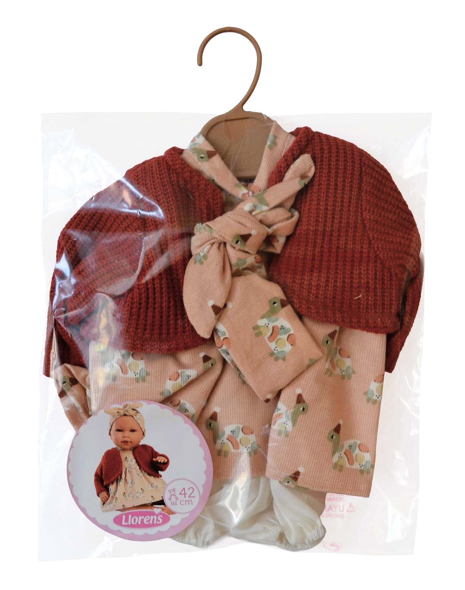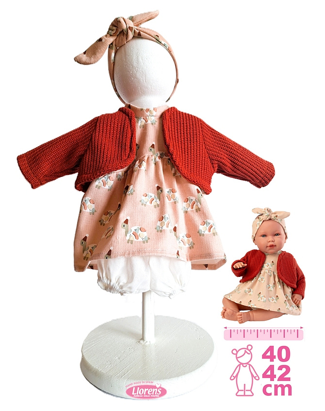 4dílný obleček pro panenku miminko NEW BORN Llorens velikosti 40-42 cm. Vyrobeno ručně ve Španělsku, baleno v igelitovém obalu s ramínkem. Doporučený věk od 3 let.