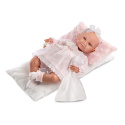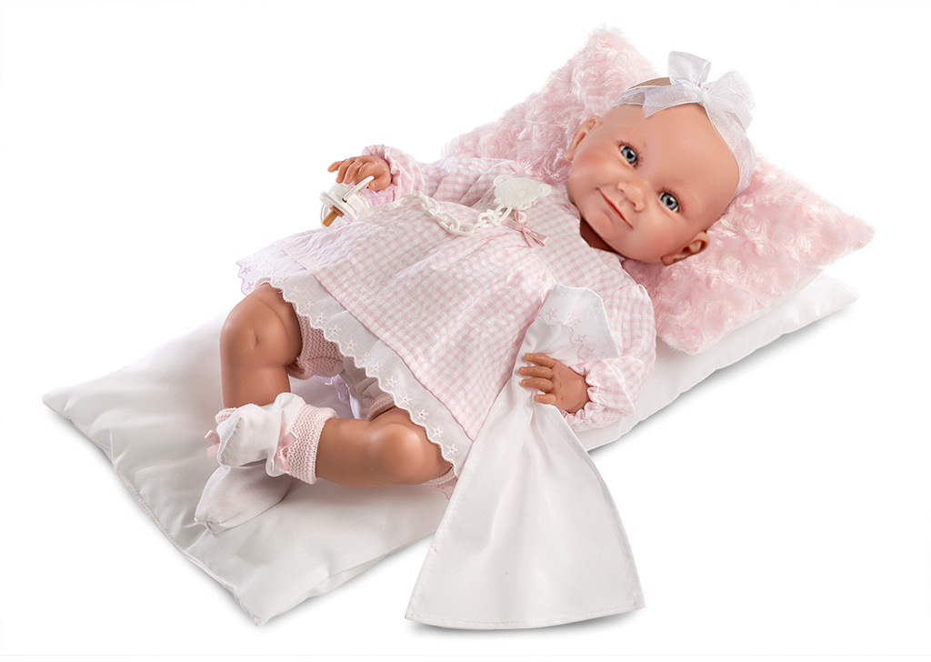 3dílný obleček s ozdobným polštářkem a peřinkou a plátěným kapesníčkem staženým průhlednou stužkou, kterou jde použít jako ozdobu na hlavu. Určeno pro panenku miminko NEW BORN Llorens velikosti 40-42 cm. Vyrobeno ve Španělsku, baleno v igelitovém obalu s plastovým nebo kartonovým ramínkem. Doporučený věk od 3 let.