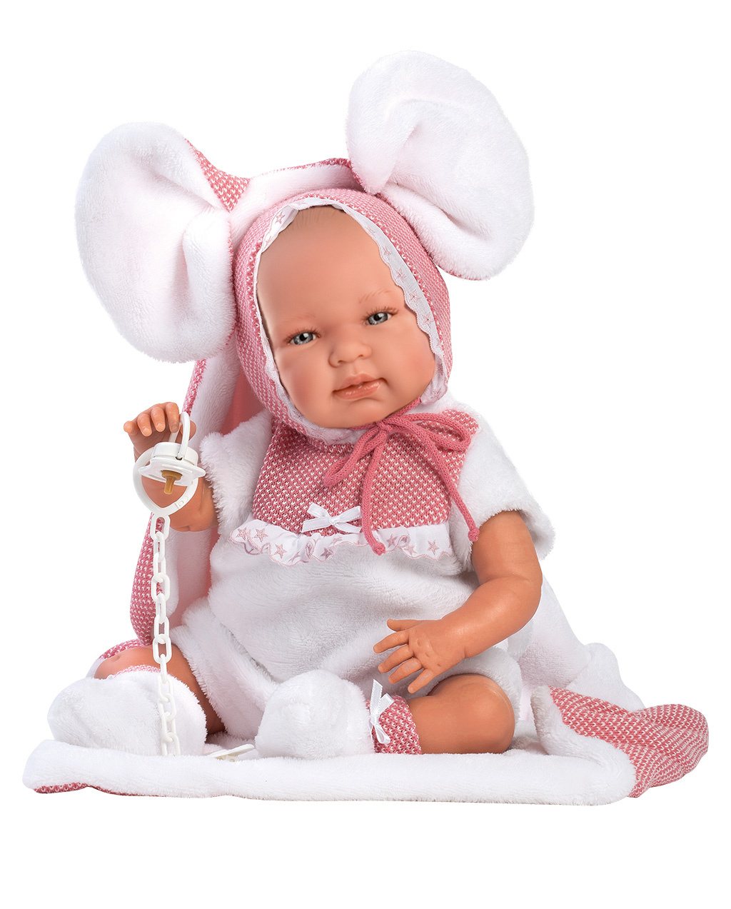 3dílný obleček s ozdobnou podložkou s ouškama pro panenku miminko NEW BORN Llorens velikosti 40-42 cm. Vyrobeno ve Španělsku, baleno v igelitovém obalu s plastovým nebo kartonovým ramínkem. Doporučený věk od 3 let.