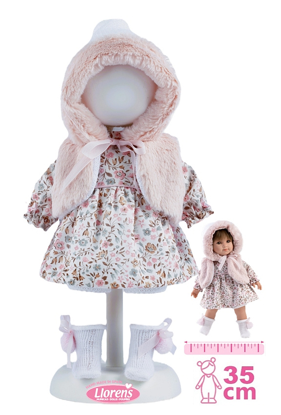 5dílný obleček pro panenku Llorens velikosti 35 cm. Vyrobeno ručně ve Španělsku, baleno v igelitovém obalu s ramínkem. Doporučený věk od 3 let.