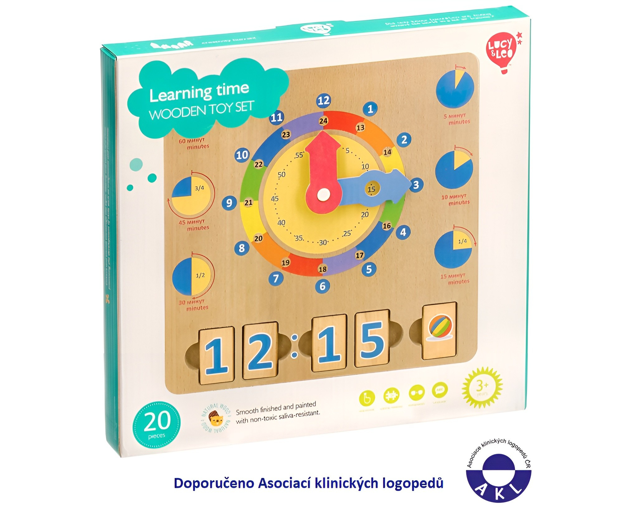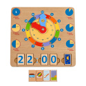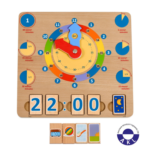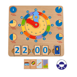 Učíme se hodiny je dřevěná naučná hrací deska s hodinami, určená k výuce hodin, časových intervalů a celkového pochopení, jak čas vlastně běží. Deska obsahuje obrázky různých časových intervalů a velké barevné hodinové ručičky s jasnými časovými segmenty. Dále ji tvoří 14 bloků s čísly a 6 bloků s obrázky denních činností. Čtyři časové bloky lze vložit do zdířek tak, aby představovaly digitální hodiny, a pátý blok představuje akci, která je přítomna v denním režimu dítěte ve stanovenou dobu. Tímto hravým způsobem se děti rychle naučí pouhým pohledem rozeznávat a určovat čas a hodiny. Rozměr desky 24 x 24 x 1 cm, rozměr bloků 4 x 2,5 cm.