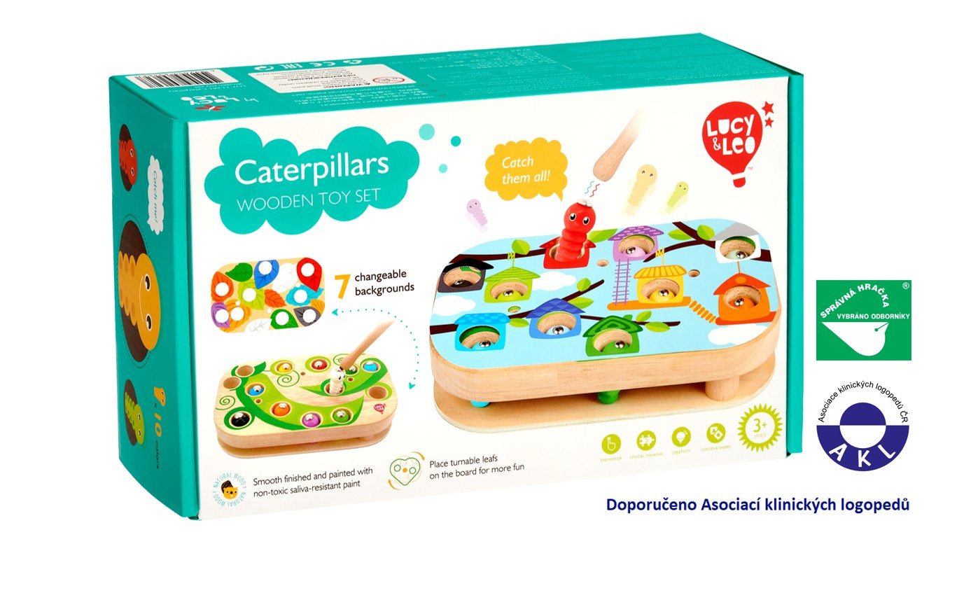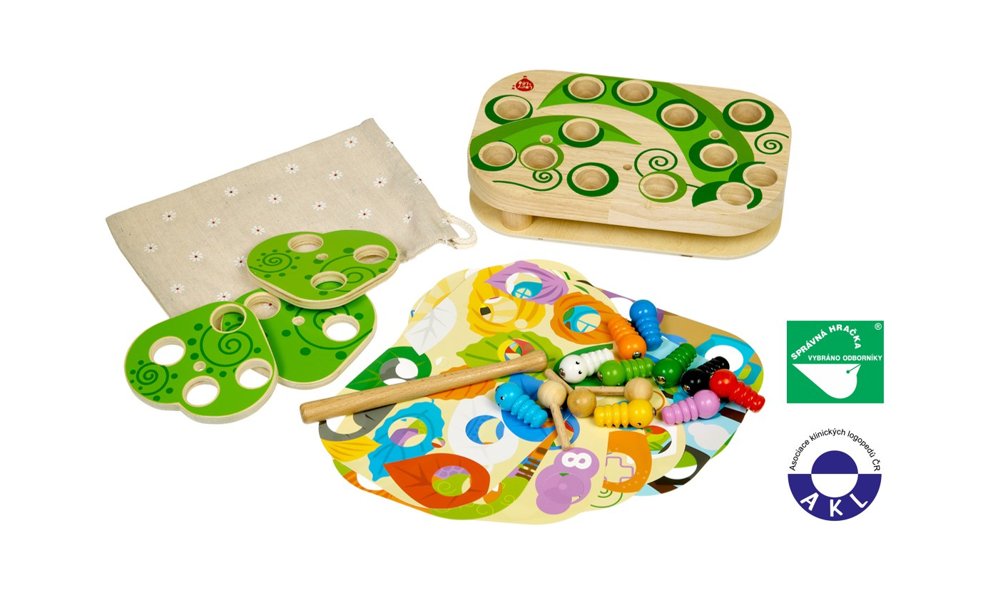 Chytání housenek je dřevěná motorická stolní hra s magnety, která se skládá ze základní dřevěné desky, 9 barevných vyměnitelných předloh, 10 barevných housenek s magnetem, magické hůlky s magnetem, 3 otáčivých listů, 3 kolíků pro upevnění listů a lněného pytlíku. Šibalské housenky začaly hrát na schovávanou! Najděte a chyťte je společně s dětmi pomocí kouzelné hůlky s magnetem. Způsobů, jak pochytat housenky je spousta. Pro menší děti přiložte na základní desku jednu z barevných předloh, vložte housenky do otvorů například podle barev a lov kouzelnou magnetickou hůlkou může začít. Vyměňováním předloh mohou děti housenky lovit například z barevných listů, domečků nebo také podle čísel. Starším dětem ztížíte chytání housenek tím, že na předlohu přidáte otáčivé listy, které zafixujete kolíkem tak, aby se mohly po předloze rotačním způsobem pohybovat a tím lovení ztížíte. Tato hra je velmi užitečná pro rozvoj logického myšlení, kreativity, obratnosti a dětské motoriky. Součástí výrobku je lněný pytlík, do kterého si menší části hry pěkně uložíte.