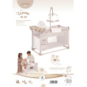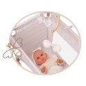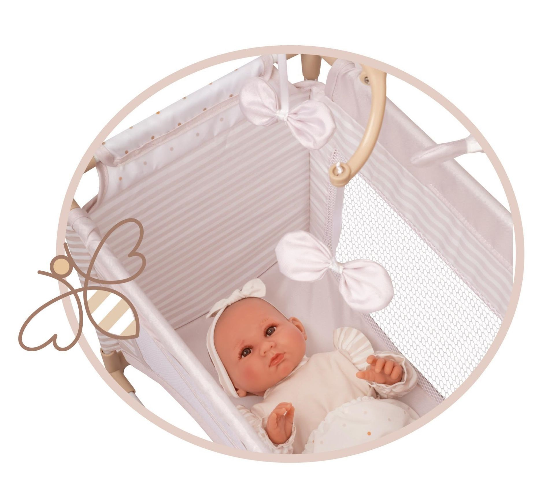 DeCuevas 53178 Moje první postýlka pro panenky s hracím centrem Verona 2025 patří do stejnojmenné, velmi úspěšné kolekce z roku 2024, která nabízí nejen zmíněné kočárky, ale i jiné doplňky pro malé slečny a jejich panenky. Tato decentní kolekce se celá nese v jemných pastelových přírodních barvách i vzorech. Kombinace světle béžové a bílé s roztomilými puntíky nebo proužky doplňuje světle hnědé úzké lemování, které zdůrazňuje dokonalost tvarů a krásně ladí s hnědými madly kočárků. Přírodní styl kolekce podtrhují aplikace mašliček zobrazující okvětní lístky a drobné výšivky včeliček.