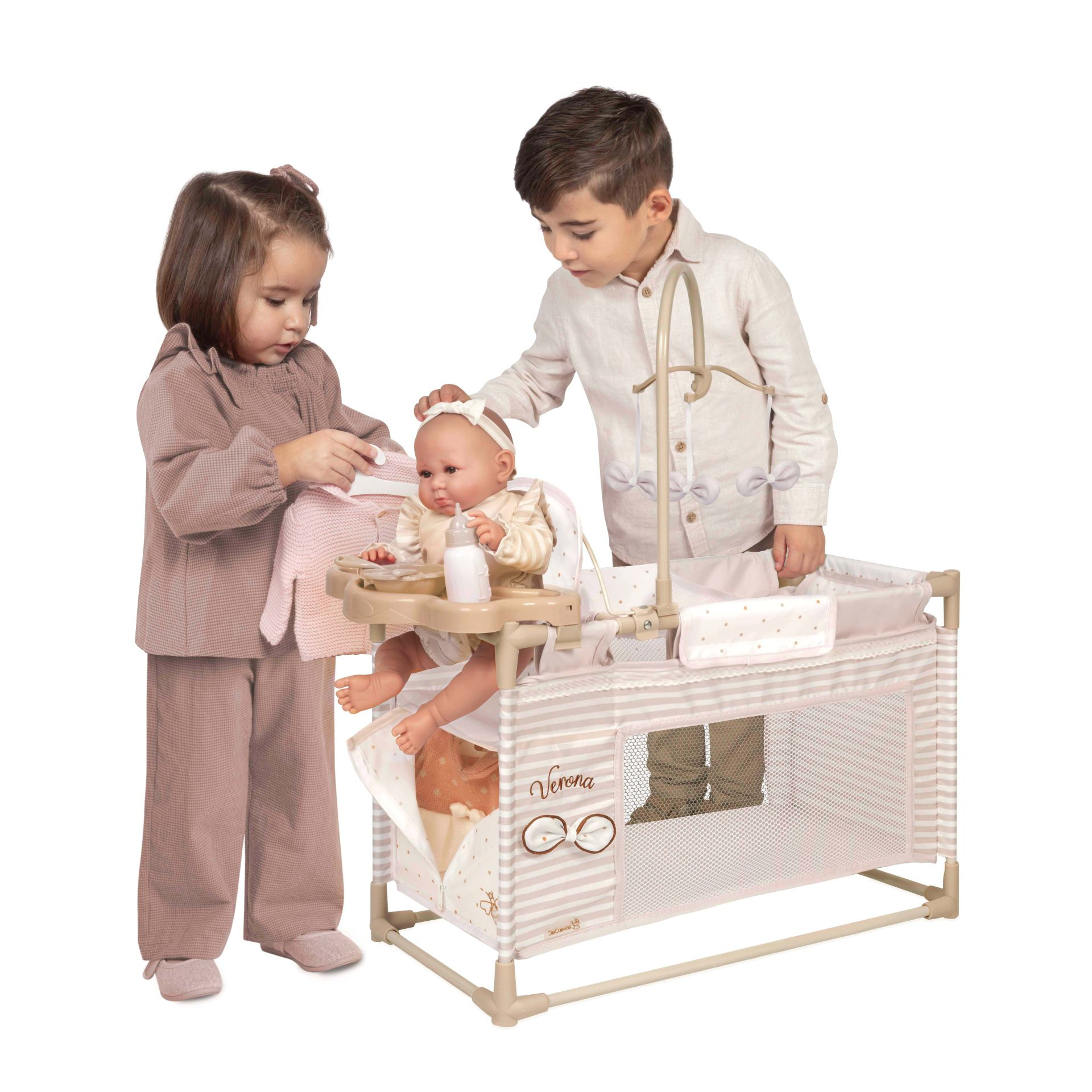 DeCuevas 53178 Moje první postýlka pro panenky s hracím centrem Verona 2025 ze stejnojmenné, velmi úspěšné kolekce z roku 2024 je u holčiček oblíbená díky svému rozmanitému příslušenství a úložnému prostoru, který ocení i pořádkumilovné maminky. Kolekce nabízí nejen zmíněné kočárky, ale i jiné doplňky pro malé slečny a jejich panenky. Decentně laděná kolekce Verona se celá nese v jemných pastelových přírodních barvách i vzorech. Kombinace světle béžové a bílé s roztomilými puntíky nebo proužky doplňuje světle hnědé úzké lemování, které zdůrazňuje dokonalost tvarů a krásně ladí s hnědými madly kočárků. Přírodní styl kolekce podtrhují aplikace mašliček zobrazující okvětní lístky a drobné výšivky včeliček. Nádherný španělský design, precizní zpracování. Velmi snadná manipulace během samotné hry. Materiál: kov, plast, textil. Baleno v krabici v barvách kolekce. Doporučený věk od 3 let.