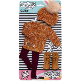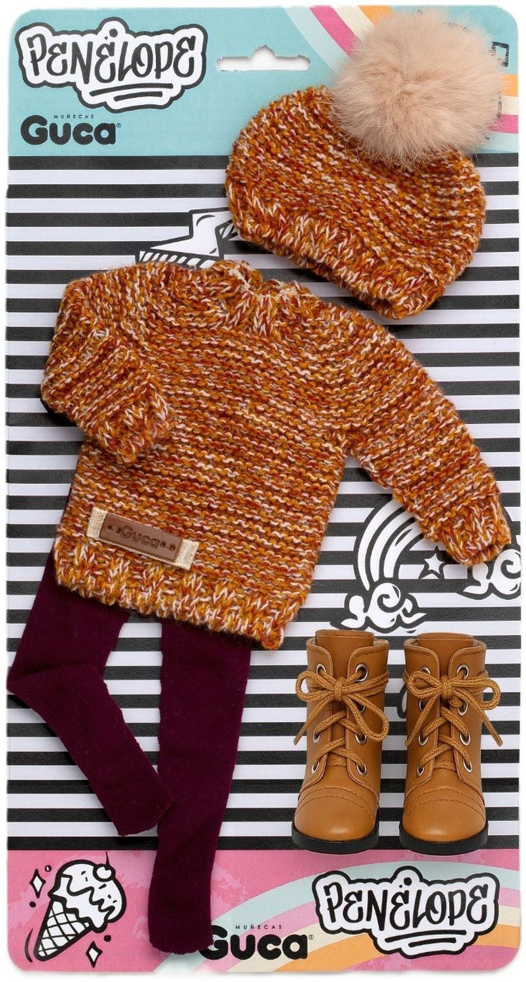 4dílný set: 3 kusy oblečení a botičky pro panenku Penelope velikosti 34 cm. Vyrobeno ručně ve Španělsku, baleno v igelitovém obalu na kartonové podložce. Doporučený věk od 3 let.