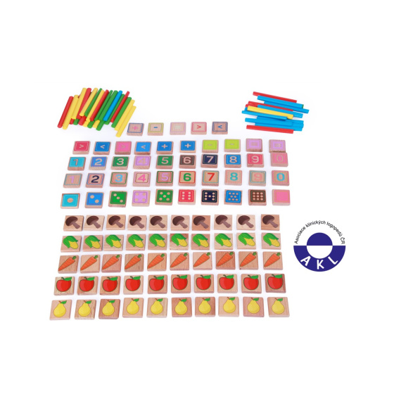 Učíme se počítat je dřevěný edukativní set obsahující 135 prvků, který pomůže dětem vzbudit zájem o matematiku, osvojit si základní počítací schopnosti a prozkoumat koncept „více“ a „méně“. Lze jej použít pro děti předškolního i mladšího školního věku. Dřevěné kostky mají na sobě malovaná čísla i jiné obrázky, což umožňuje počítat různé kategorie předmětů. Jsou zde také matematické znaménka, stejně jako tečky na hracích kostkách a barevné počítací tyčinky - pro vytvoření zdravého zážitku z průzkumu matematiky. Hra se doporučuje hrát pod dohledem dospělé osoby. Délka tyčinek 8 cm. Rozměr kartiček 2,5 x 2,5 x 0,5 cm.