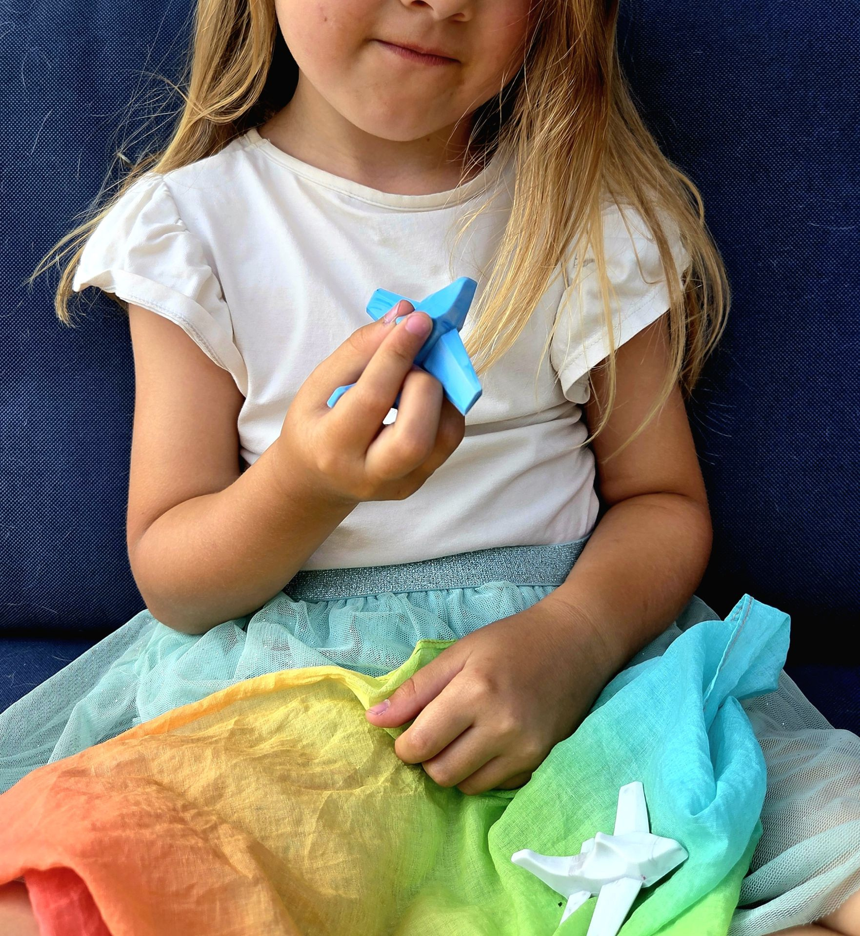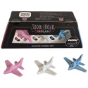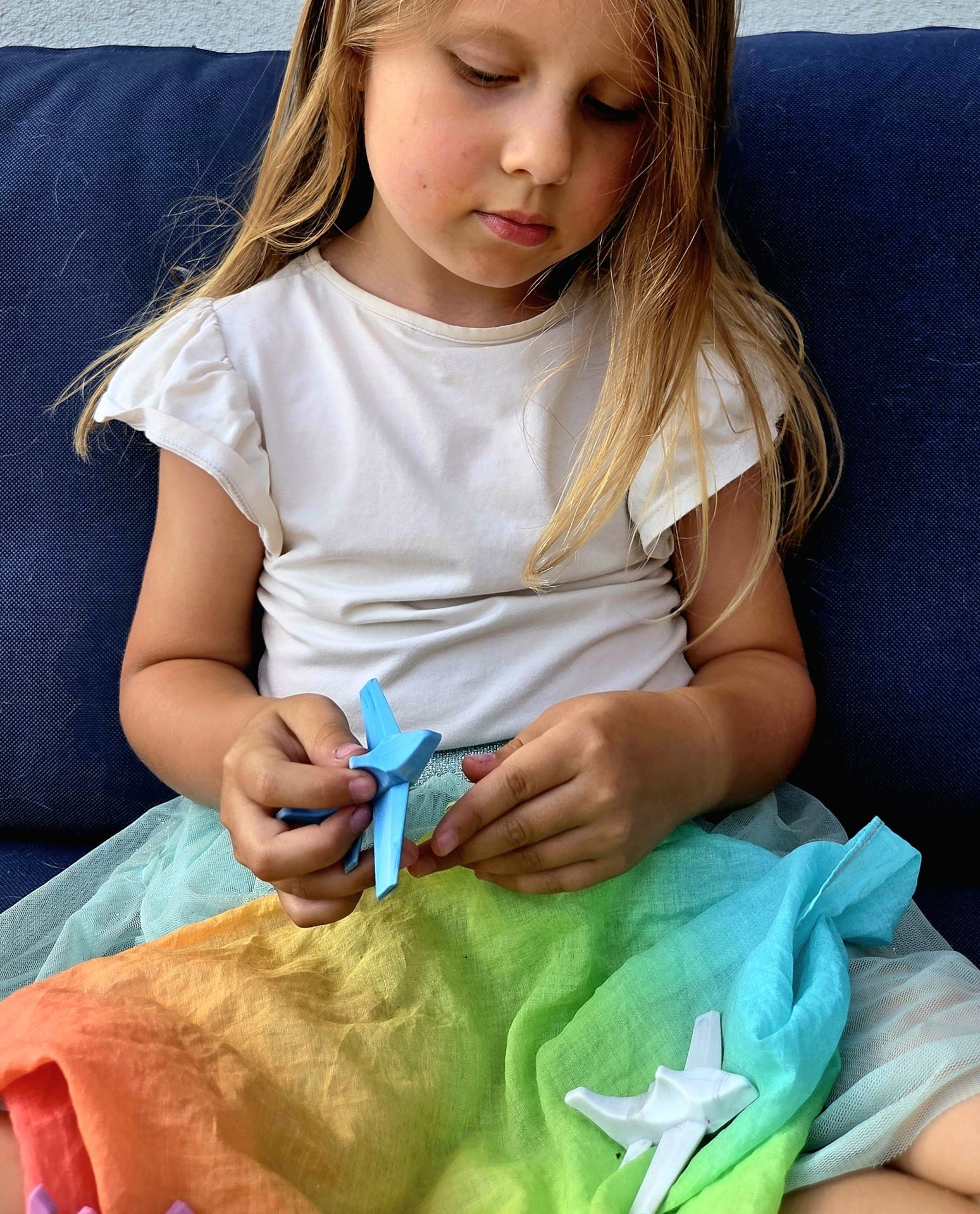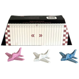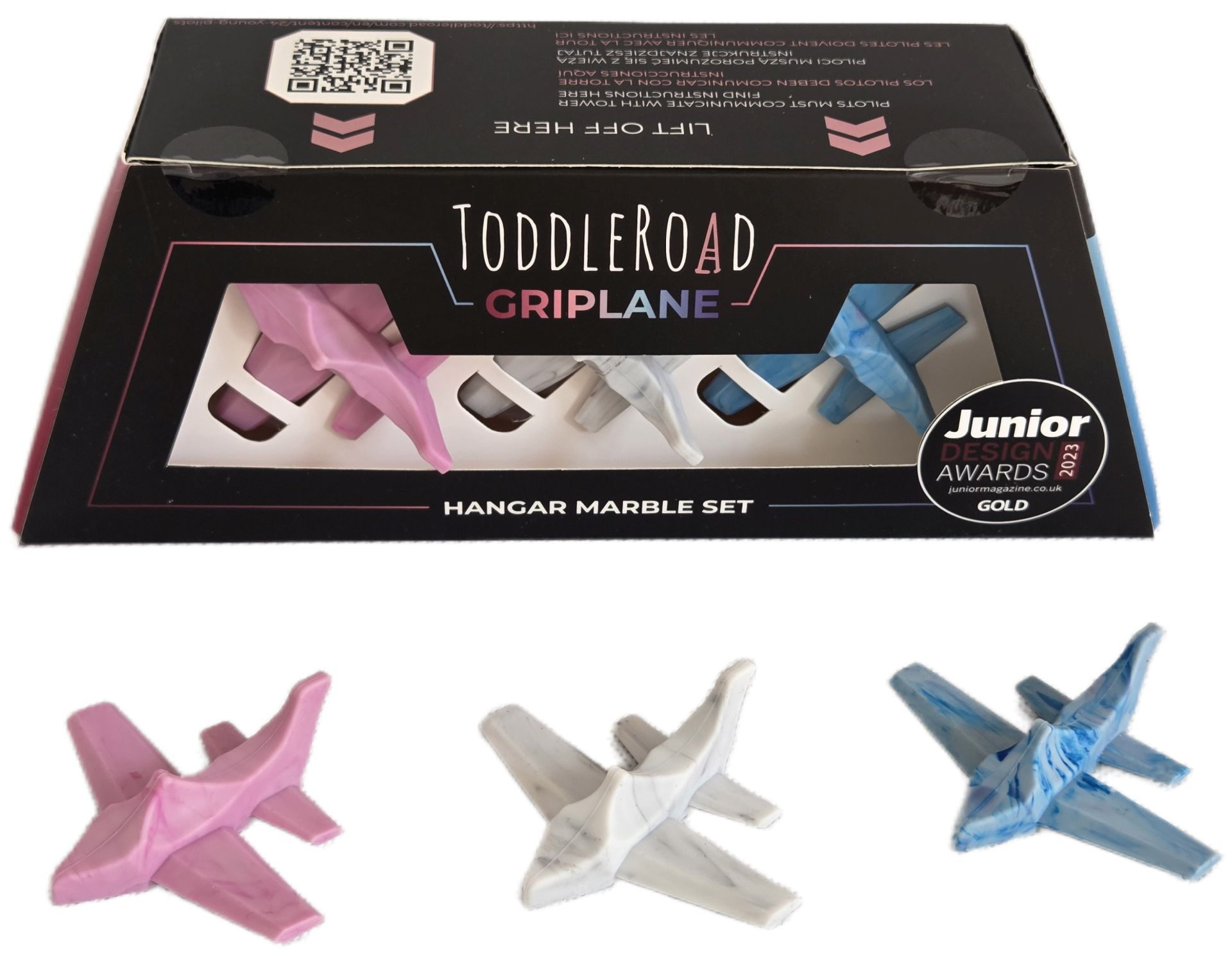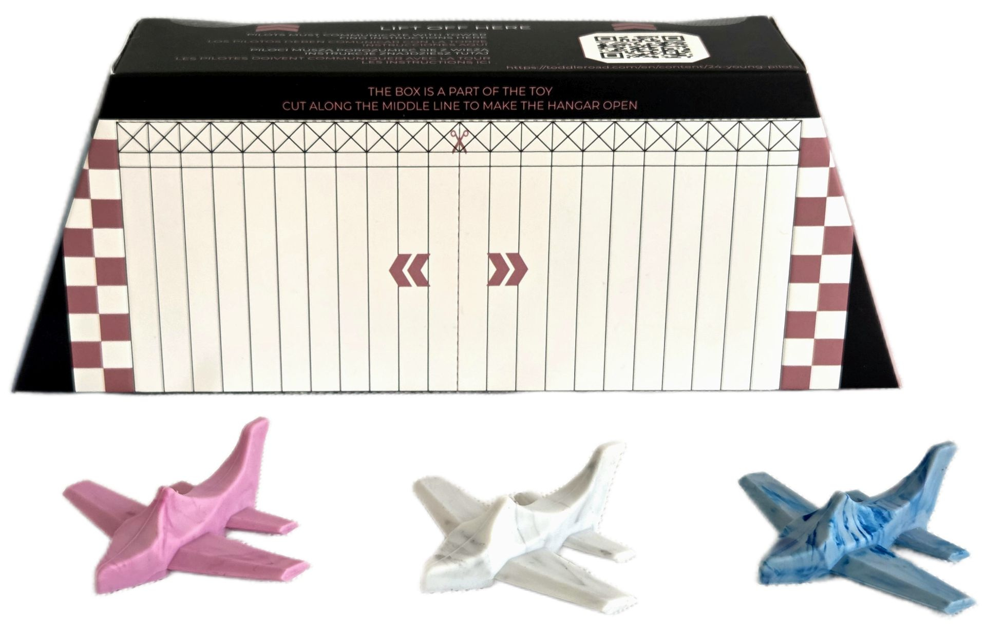 • 3 silikonová ergonomicky tvarovaná letadla v pastelových barvách s mramorovým žíháním, funkční krabice s potiskem hangáru