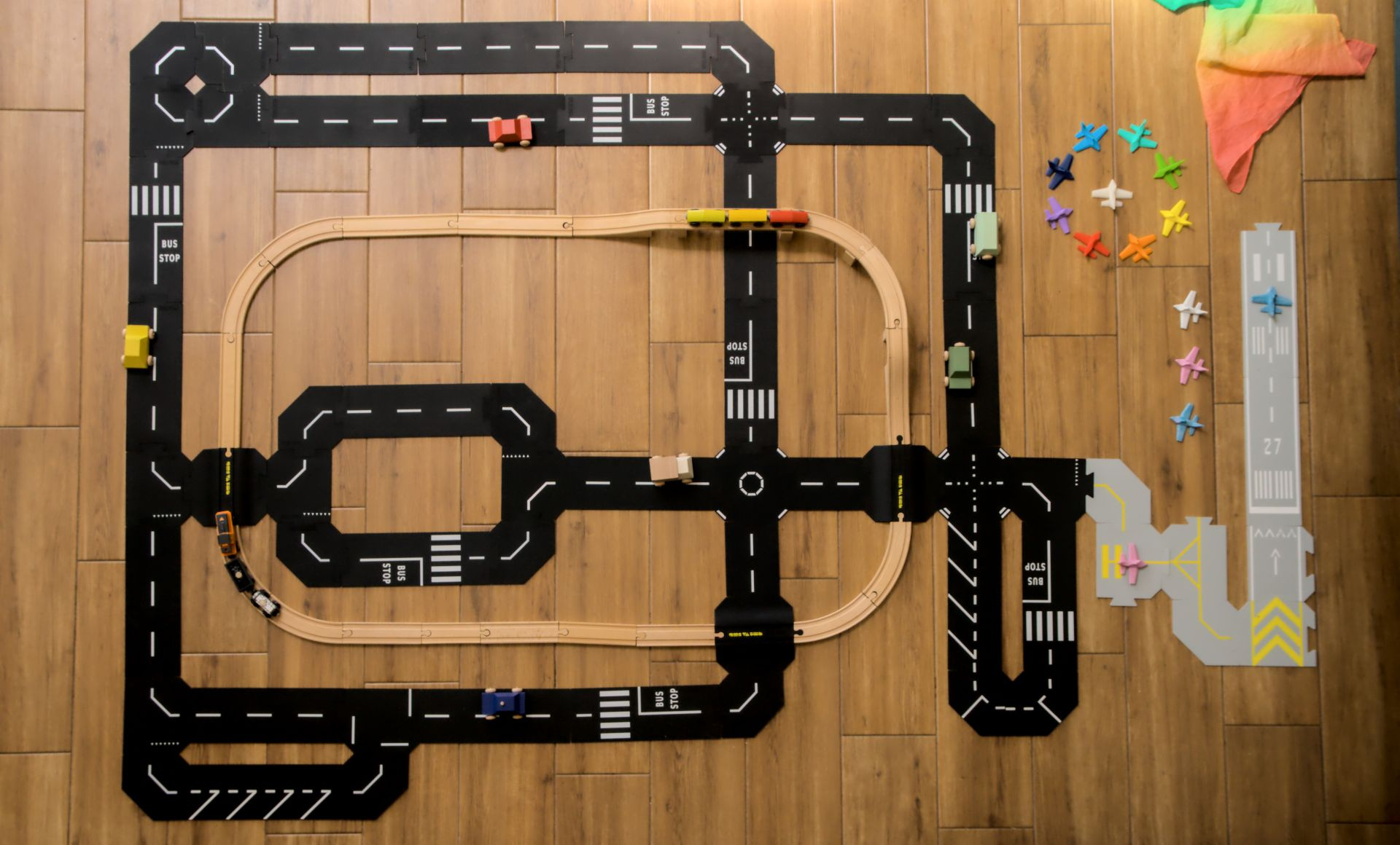 Popis TODDLEROAD 2195 ŽELEZNIČNÍ PŘEJEZD SE SILNICÍ - flexibilní silnice - 2 silikonové puzzle díly