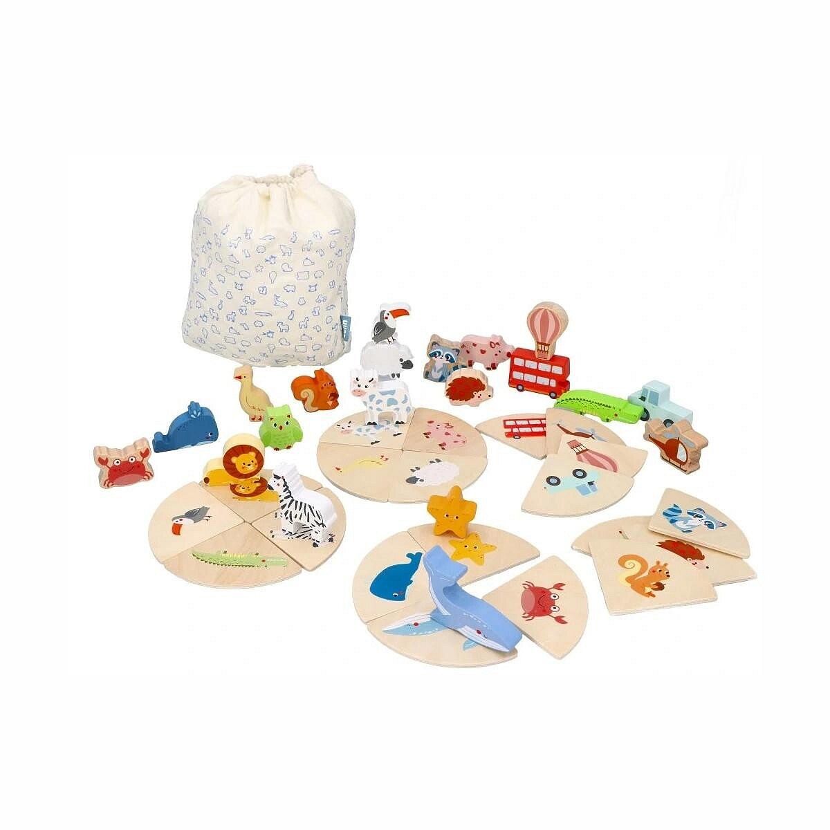 20 dřevěných dlaždic, 20 figurek zvířat a vozidel a bavlněný pytel.